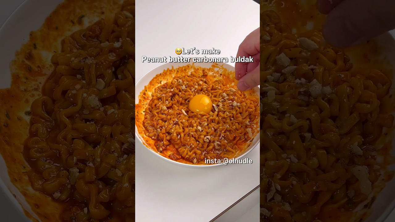 @olnudle 1 year ago peanut butter carbonara buldak ramen recipe! so yummy~– ingredients egg yolk carbonara buldak ramen some nuts ramen water 4 peanut butter 0.5– How to make 1. put the ramen in boiling water and cook 2. Pour out some water 3. In bowl, mix together the buldak powder, buldak sauce, peanut butter, and ramen water 4. add ramen in bowl 5. mixmix 6. put egg yolk on top of the ramen 7. add nuts 8. mix and enjoy