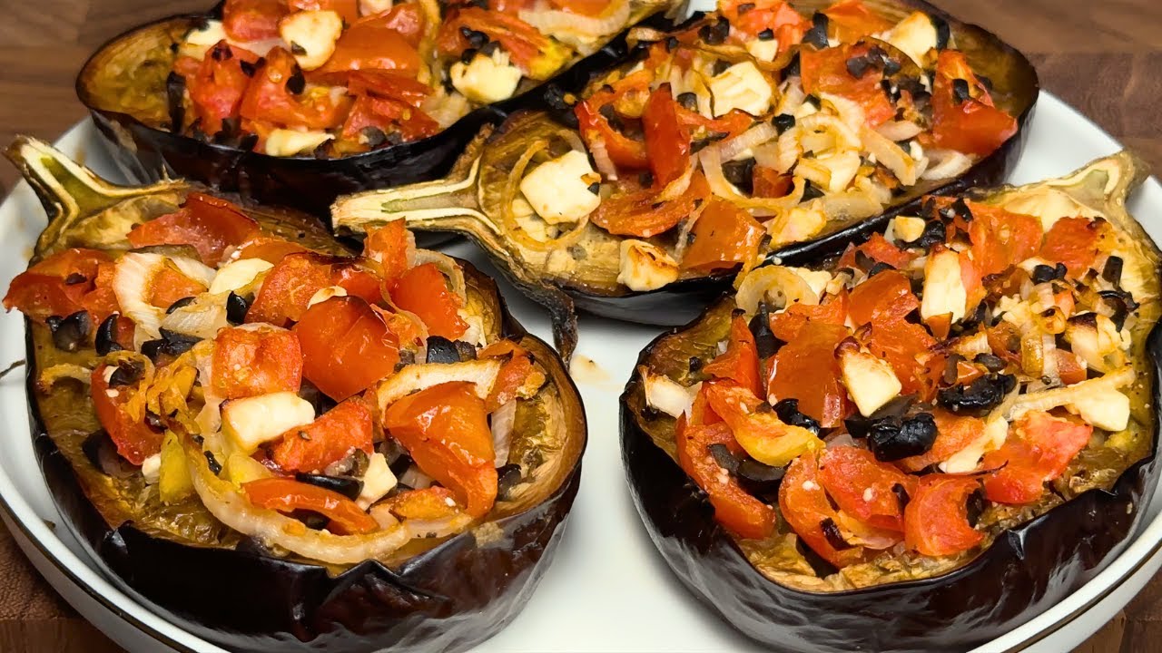 Hallo Freunde! Heute präsentiere ich euch ein sehr leckeres und einfach zuzubereitendes Rezept. Gebackene gefüllte Auberginen nach griechischer Art mit Tomaten, Oliven und Feta sind ein wirklich köstliches, leichtes und gesundes Gericht. Ihr könnt sie zum Mittag- oder Abendessen zubereiten. Ihr braucht nur ein paar einfache Zutaten und wenig Zeit für die Zubereitung. Ich versichere euch, dass auf diese Weise zubereitete Auberginen jedem schmecken werden! Probiert dieses köstliche und einfache Rezept für Auberginen nach griechischer Art mit Oliven, Kirschtomaten und Feta und lasst mich in den Kommentaren wissen, was ihr davon haltet!