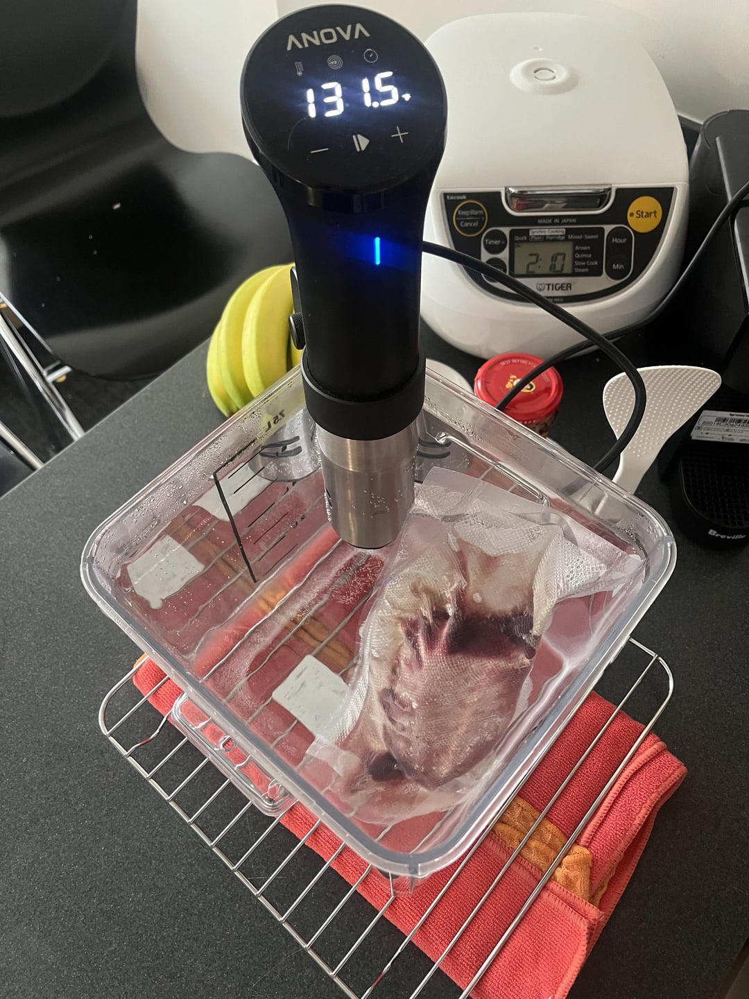 First time making a top round roast (London broil). Got mixed opinions searching on here, some say 24+ hours, others say since it’s a lean cut it doesn’t benefit from time. Threw it in frozen 131.5F for 8 hours. Then put it in an ice bath for 5 minutes before searing. Seared on a stainless steel pan, roughly 30-45 seconds for each of the 3 sides (weird cut) and the last side threw in a bit of butter and spooned it over.