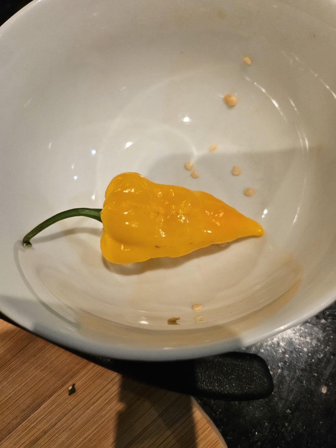 Got these peppers from a friend who grew them, but we're not quite sure what they could be. I thought it could be yellow scorpion but the shape doesn't fully match some pictures I saw online. Very fruity and hot.