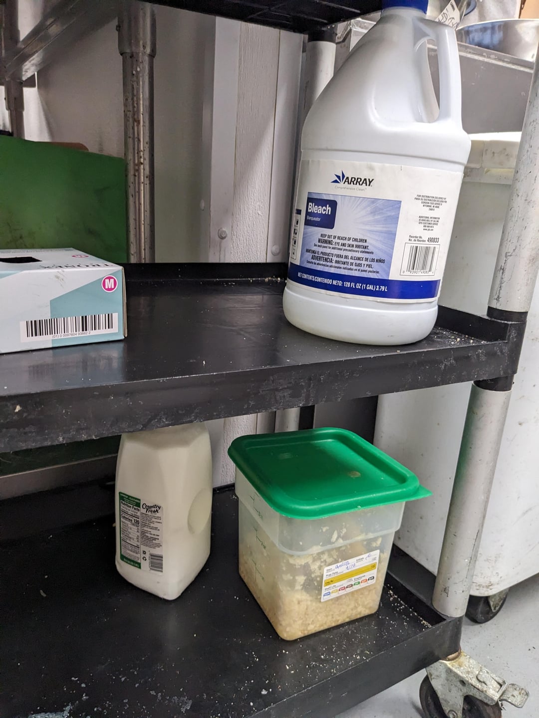 Why is bleach ABOVE foods? FFS. What kinda kitchen you running there? Chemicals and foods shouldn’t be even on the same damn rack