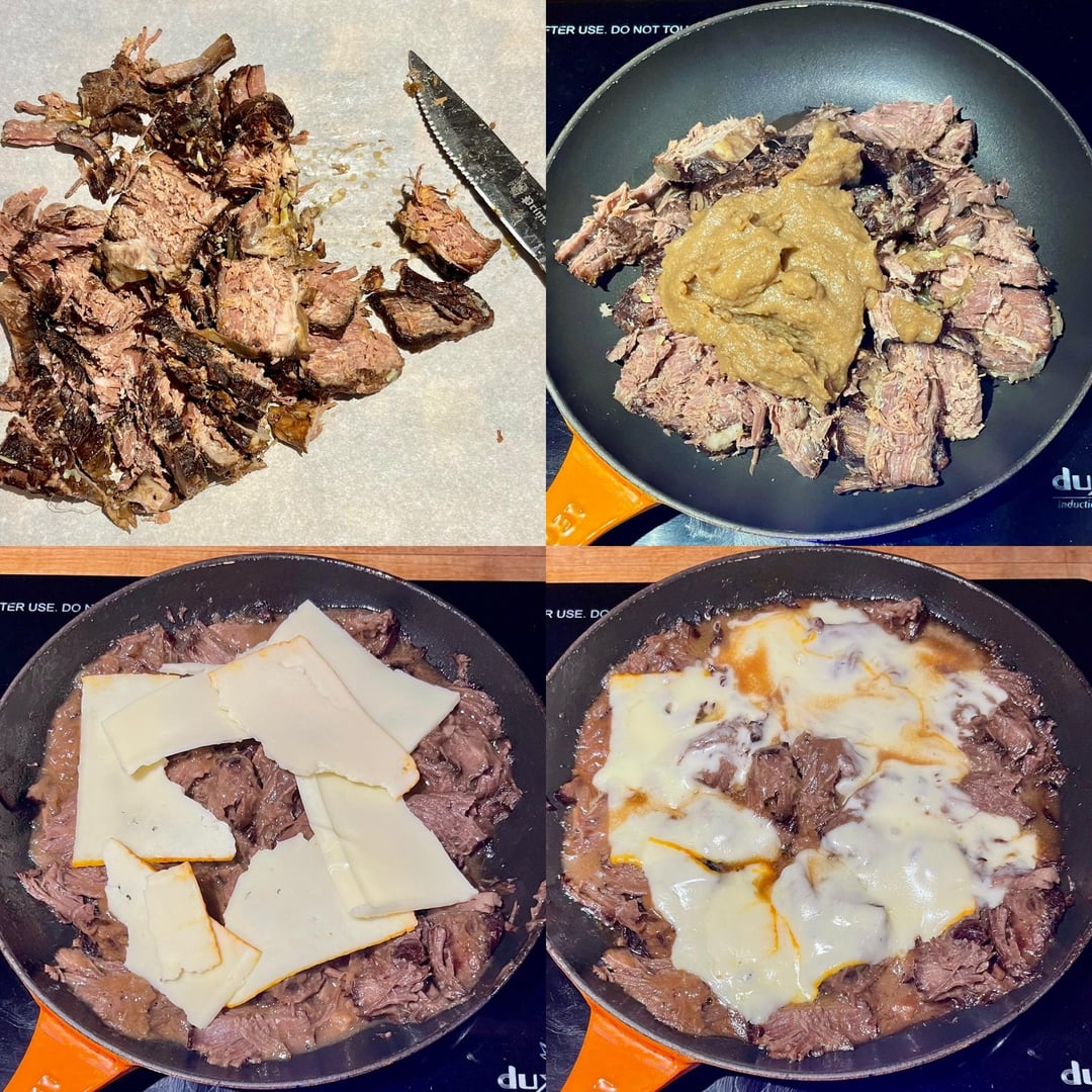 chopped up some leftover pot roast and reheated it on low with the leftover gravy then added some mozzarella and muenster cheese; a little creamed horseradish on a toasted kaiser roll and it was good to go.