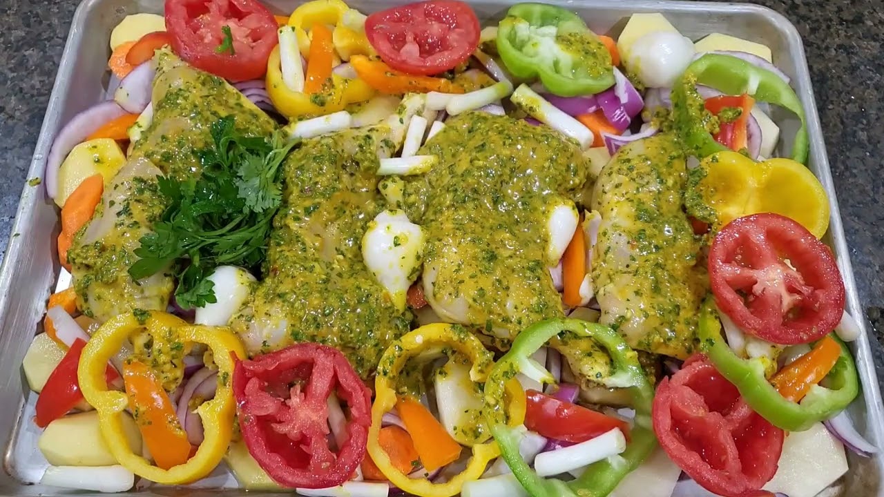 I used a baking sheet, add sliced potatoes 2″, add sliced onions, carrots & other veggies as shown in the video