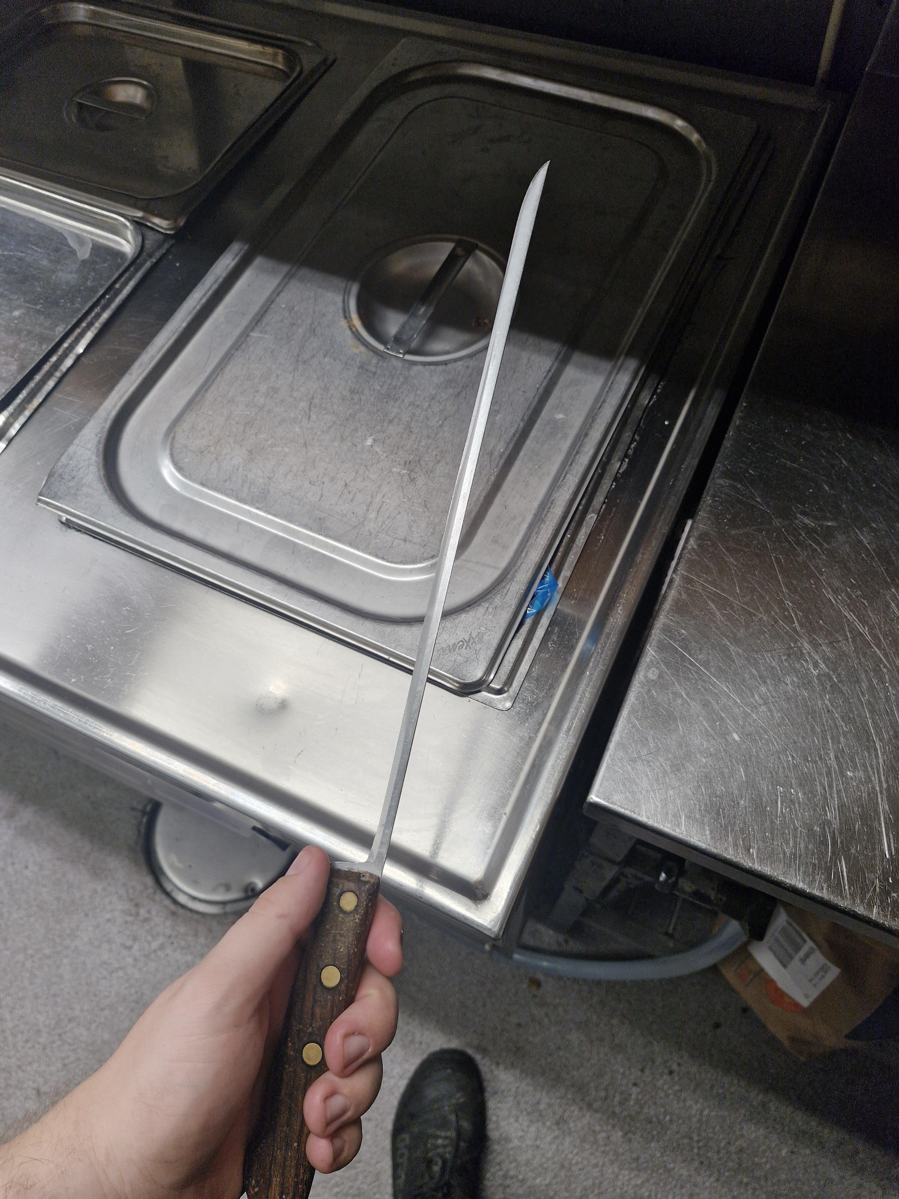 Started working in a new kitchen and saw this knife hanging on the wall by swedishMathew 37 Comments theubster 1 year ago Ah, the ol’ jumbo toothpick Gr33nanmerky13 1 year ago That sir, is a shank DeadHookerMeat 1 year ago I would be scared of that snapping unless I was cutting, like, whipped cream soggywaffles812 1 year ago The very first knife chills716 1 year ago I just picture the sharpener as the kid zoned out at the pencil sharpener and is left with a nub. Vapechef 1 year ago I’ve always wanted to try fencing tol419 1 year ago That is the sexiest knife I’ve ever seen. If it could talk it would tell me to fuck off. It probably knows who killed JFK 86thesteaks 1 year ago 🤺 J03K1ng92 1 year ago Cuts the atoms SiteAnn 1 year ago K ^^^nife HeadAbbreviations786 1 year ago Cool. Just turn it so we can see the blade profile. This is clearly a spine shot. Sensitive_End8830 1 year ago I wanna cut sashimi with this ranting_chef 1 year ago Great for prosciutto. Or gravlax. kenneth-nark 1 year ago Damn you can hunt down Moby Dick with this my guy elwood_west 1 year ago shes a beaut Bukas_K 1 year ago EN GARDE! thePHTucker 1 year ago This knife has seen some shit man.I’ll bet it filets like a champ, though. probsthrowaway2 1 year ago Knife has seen some shit Sea-Cupcake-2065 1 year ago Just let it die drewismynamea 1 year ago That could skin fish real nice m155m30w 1 year ago You found Needle! Big_Monkey_77 1 year ago Naw, that’s for shish kebabs MelodiesOfLife6 1 year ago is that even a knife anymore? looks like a toothpick. JAFO99X 1 year ago I love this. Invasive-farmer 1 year ago Looks like it lost a fight with a Ginsu. Big_Fo_Fo 1 year ago Is that the mono molecular blade they always talk about in Warhammer? web1300 1 year ago That’s gotta be really useful. onegaishimasune 1 year ago Hey you mind if I borrow it real quick, just gotta prep some bone in beef cuts _its_a_SWEATER_ 1 year ago Perfect for skinnin’. Thoreau_Dickens 1 year ago Ahhh, i see they have a house sounding rod DirtyPandaBoi 1 year ago I mean, say all you want, but I’m super impressed that that edge is pretty straight/flat after all that sharpening.I wouldn’t use it, though. But still, impressive. Jigglybutt213 1 year ago r/wellworn kittenshart85 1 year ago thing’s skinnier than i am. FrozenDickuri 1 year ago They say he carved it himself, from a bigger knife. hitch_please 1 year ago That’s not a knife Loveroffinerthings 1 year ago That knifes nickname is needledick PoprockEnema 1 year ago Is the dishie into sounding or something?Write A CommentYou must be logged in to post a comment.