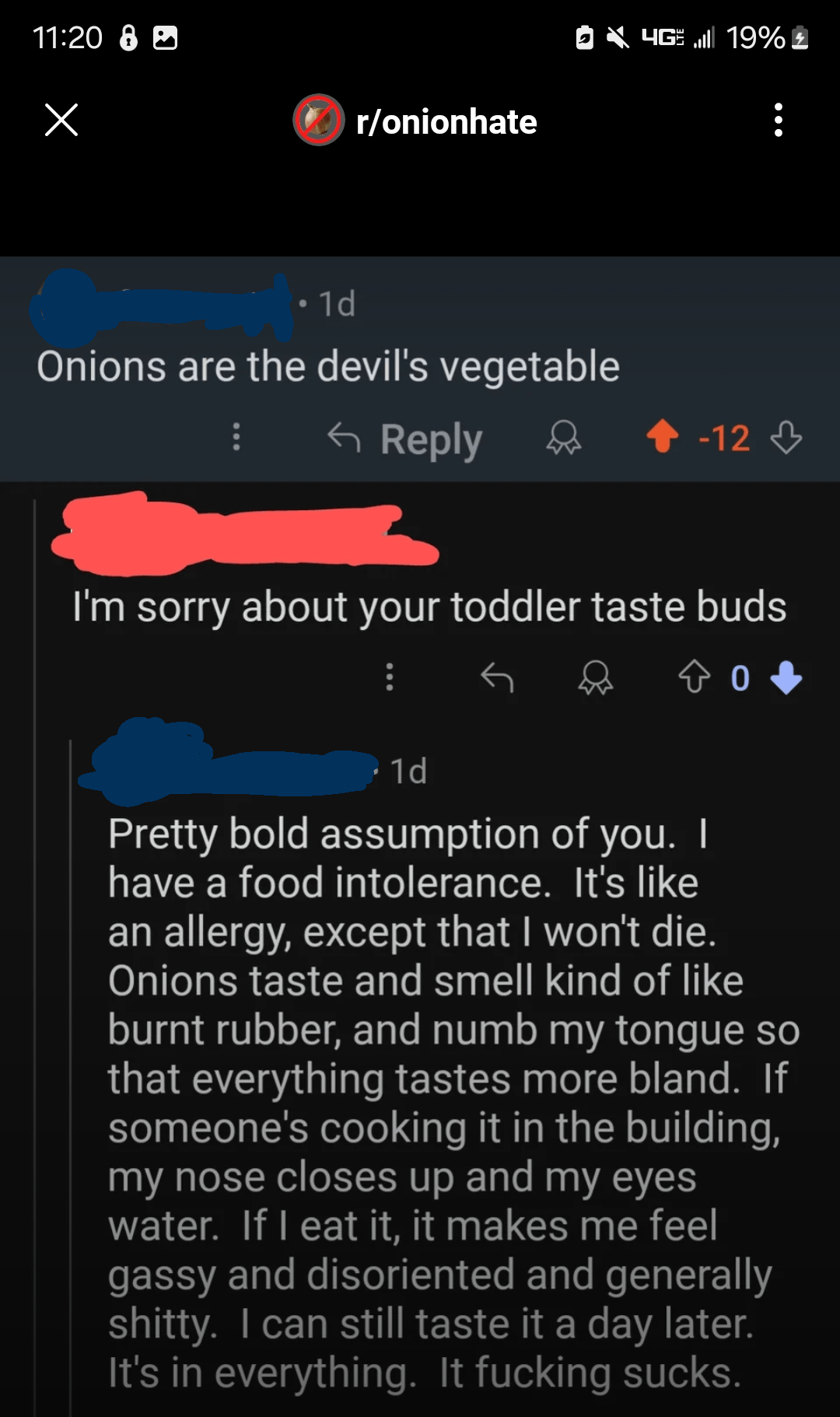 I view r/OnionHate as kind of a support group in the face of society pretty much overwhelmingly liking onions. I have absolutely no standing to say that any of them are somehow wrong in their perception, or that they’re just being picky or unnecessarily sensitive or whatever. And outright insulting them about it is frankly rather cruel. We should leave them alone.