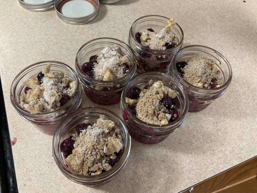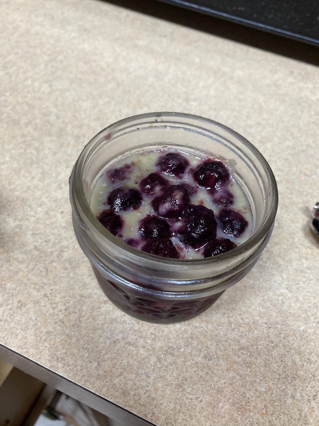 2nd time using the SOUS vide: I made some pot o creme for my bf to try and win him over to the thing and had extra pots so I… decided it was a good idea to completely wing a weird blueberry cobbler thing to fill the extra containers 😂