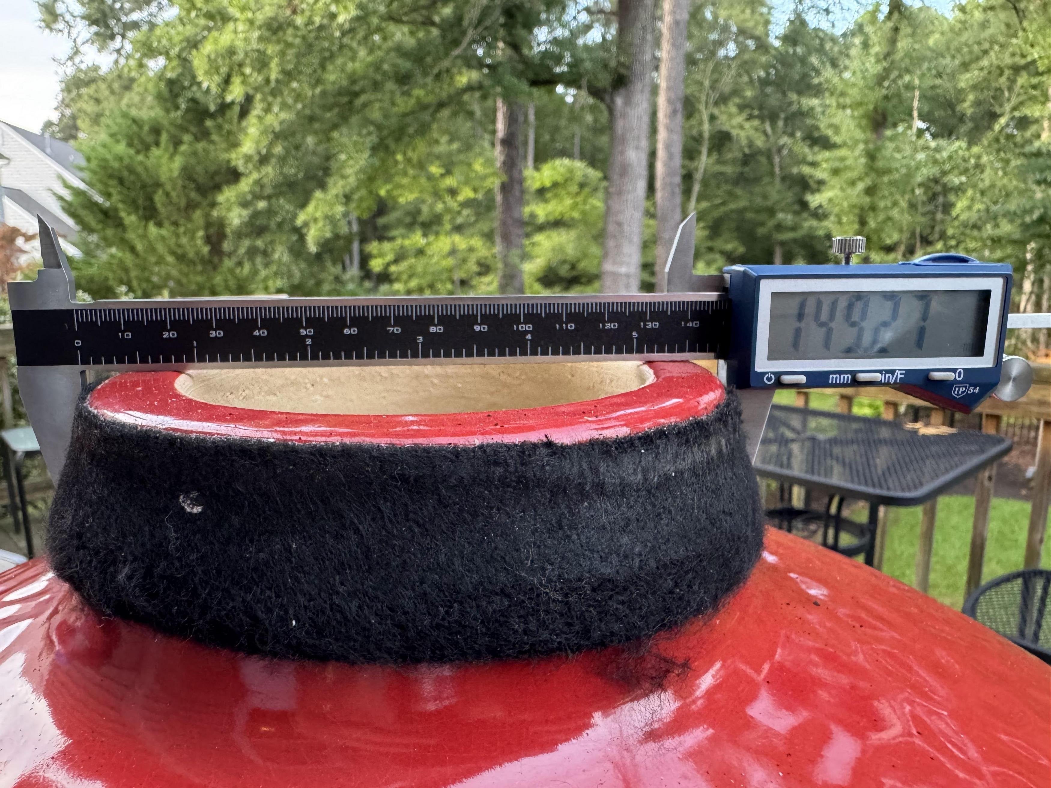 I am also including photos showing the diameter of the chimney (139mm at the top and 149mm at its base) and the cap (less than 141mm, excluding the flared part at the very bottom). I don't understand how the cap will ever fully seat on the chimney given these dimensions.
