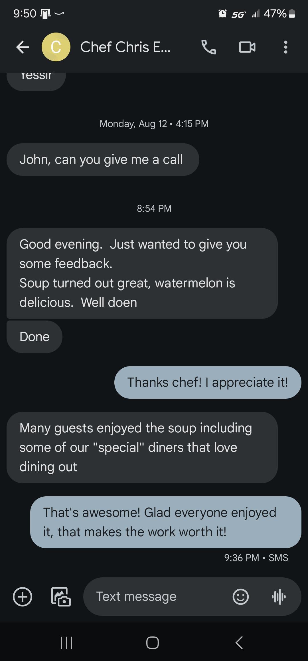 I made a vegan mushroom bisque for soup of the day, and a watermelon salad for one of the specials tonight (I opened today). I'm not sure why chef called them "special" when he just means one of our rich regulars lol. Either way, it's always nice to hear good feedback.