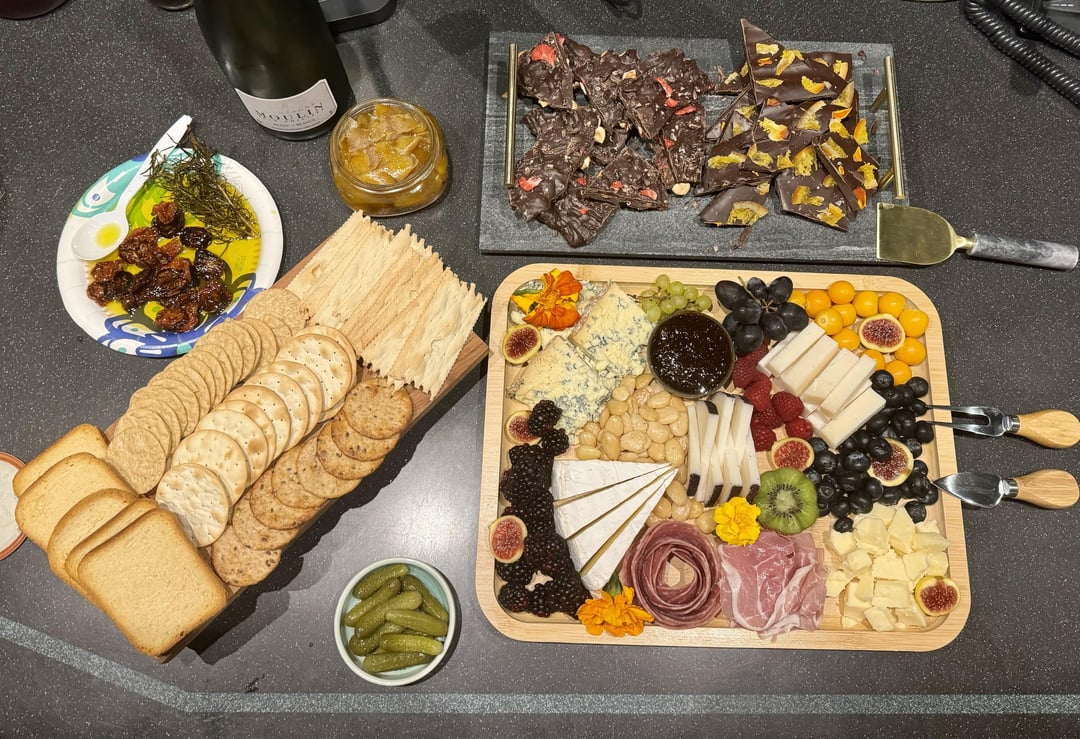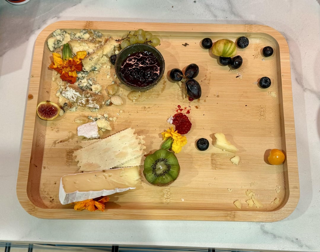 I work in entertainment and on a whim I told one of my more fun productions that we should do a wine and cheese day, and volunteered to bring a charcuterie board. I spent the week researching, gathering ingredients from the farmers market (some of which didn’t make it in because I simply didn’t have enough room on the plate) and grocery stores, and got to work.