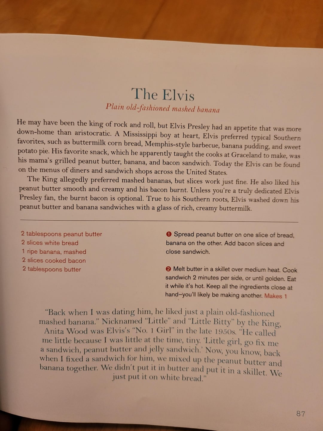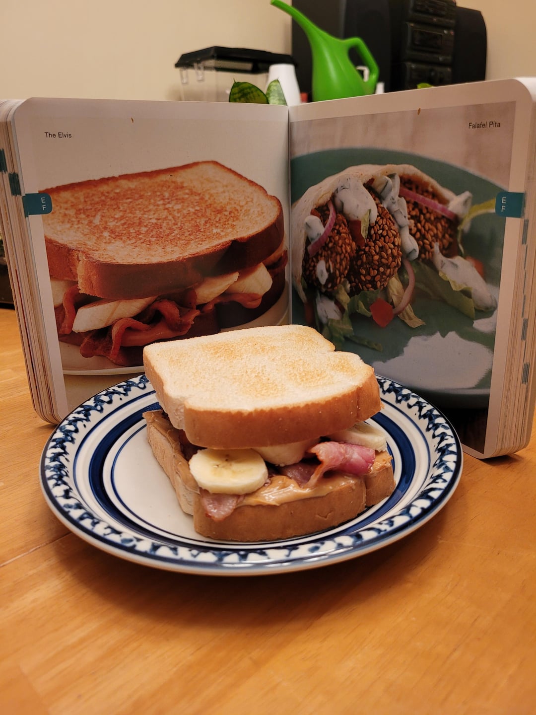 Continuing my mission to make as many sandwiches from The Encyclopedia of Sandwiches (by Susan Russo) as I can, #5 is the Elvis. It was … ok. I guess I'm not a fan of the bacon and peanut butter combo. The bacon felt super muted and barely salty, mostly sweet. It wasn't bad tho, just ok. Sorry Mr. Elvis, I'm glad at least you enjoyed it.