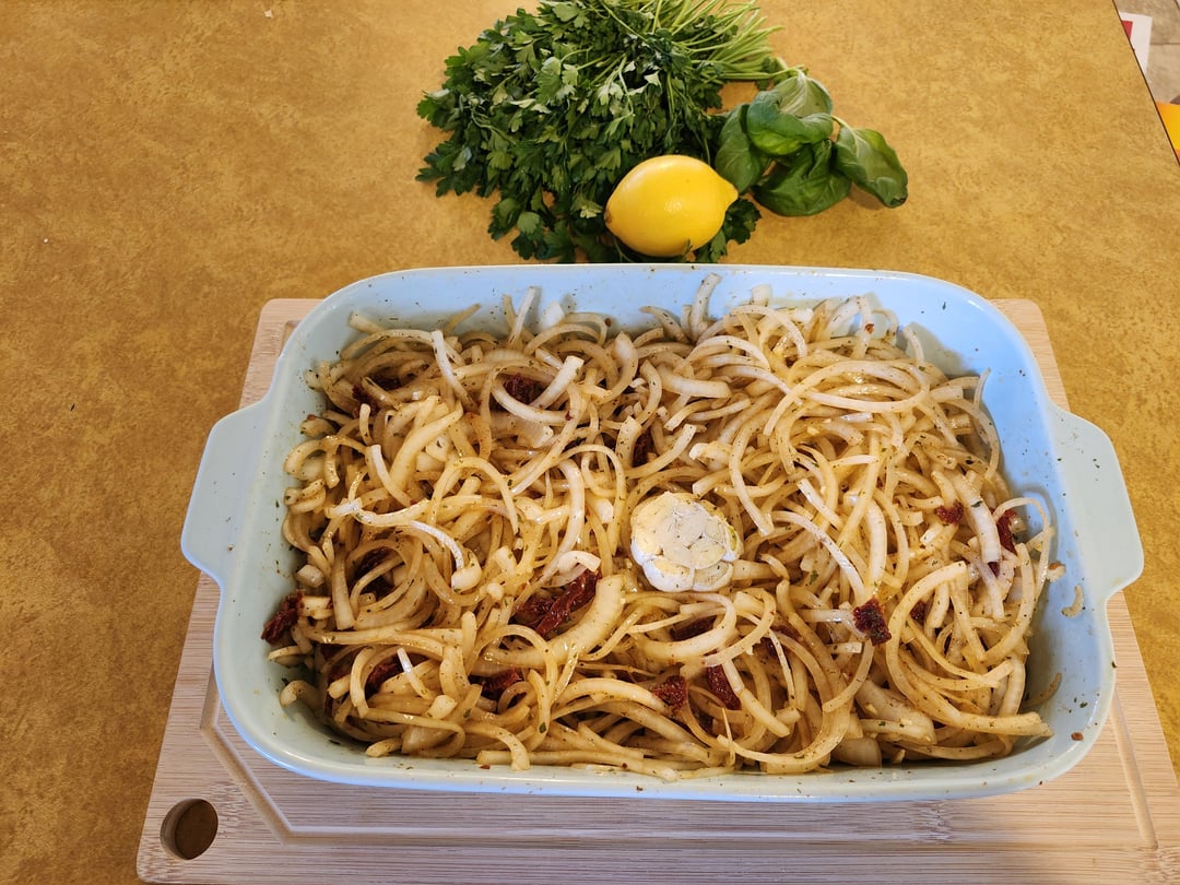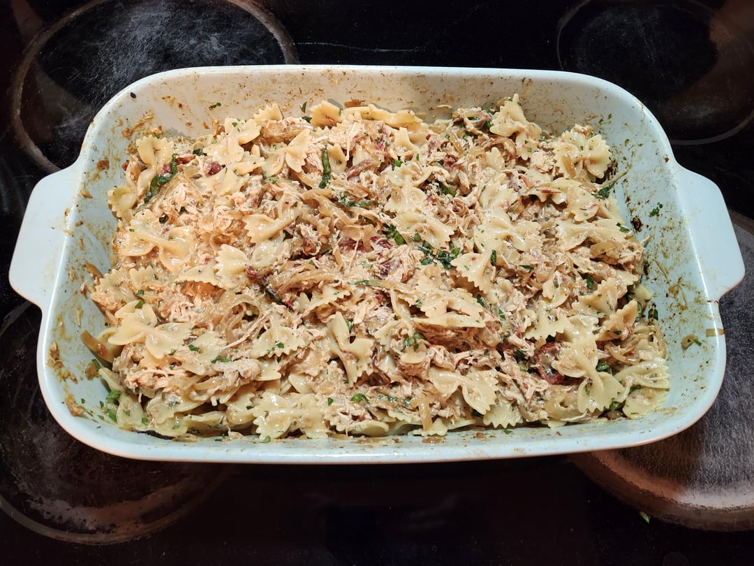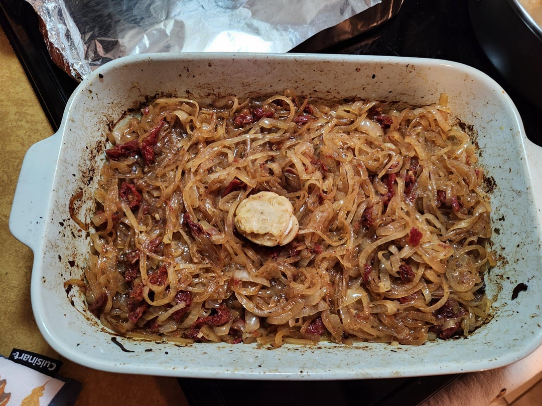 Earlier today, I posted to let you guys know that I will be making the “viral” vegan [One Pan Caramelized Onion Pasta](https://plantyou.com/one-pan-caramelized-onion-pasta/), but NOT VEGAN. I am back to tell you all how that went. I followed the original recipe pretty closely, but I added shredded chicken breasts, chicken broth, and I substituted out the coconut milk for half & half. I LOVE MY CREATION SO MUCH. This is my magnum opus, guys. I had never written down a recipe before, but I felt I had to tonight. [Here it is](https://docs.google.com/document/d/1MfiQBBW2aNGpZjcQcsYRhPjYEro-byWQvwQS5qTP4ZE/edit?usp=sharing), if anyone is interested. It is kind of a disaster of a recipe. I will happily answer any questions anyone has. Thank you for letting me share. ❤️🧅 Goodnight!