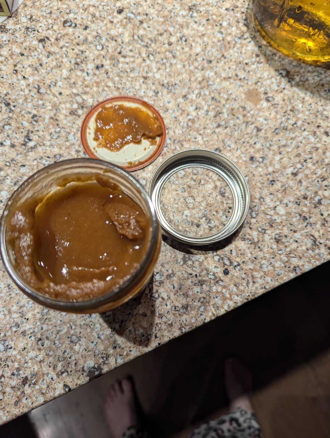 The vacuum seal was still strong, with no bulging of the lid. There's nothing growing on the glass jar grooves (see second photo), the rim of the lid, or the underside of the lid. There's no discoloration of the sauce from the original, just some separation of solids (which other peach sauce jars also did, even when they were fresh, I would just shake them).