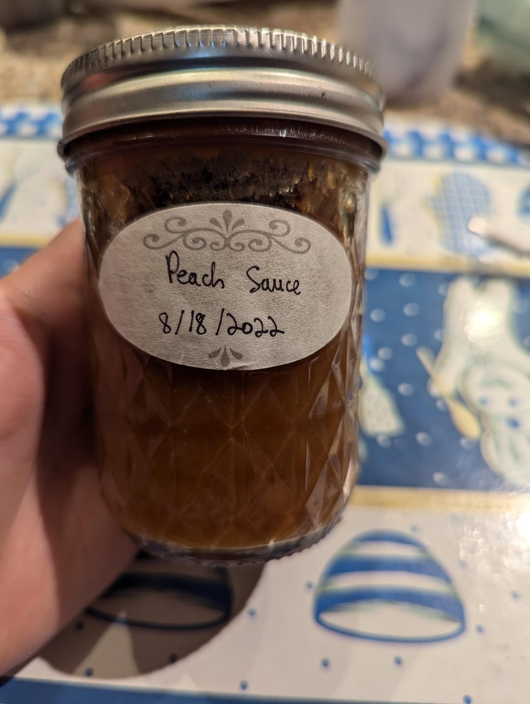 As you can see from the label, I made this peach sauce (from fruit from my own peach tree!) in 2022. It's peeled peaches brought to a simmer, blended, and mixed with brown sugar, spices and a little peach and lemon juice.