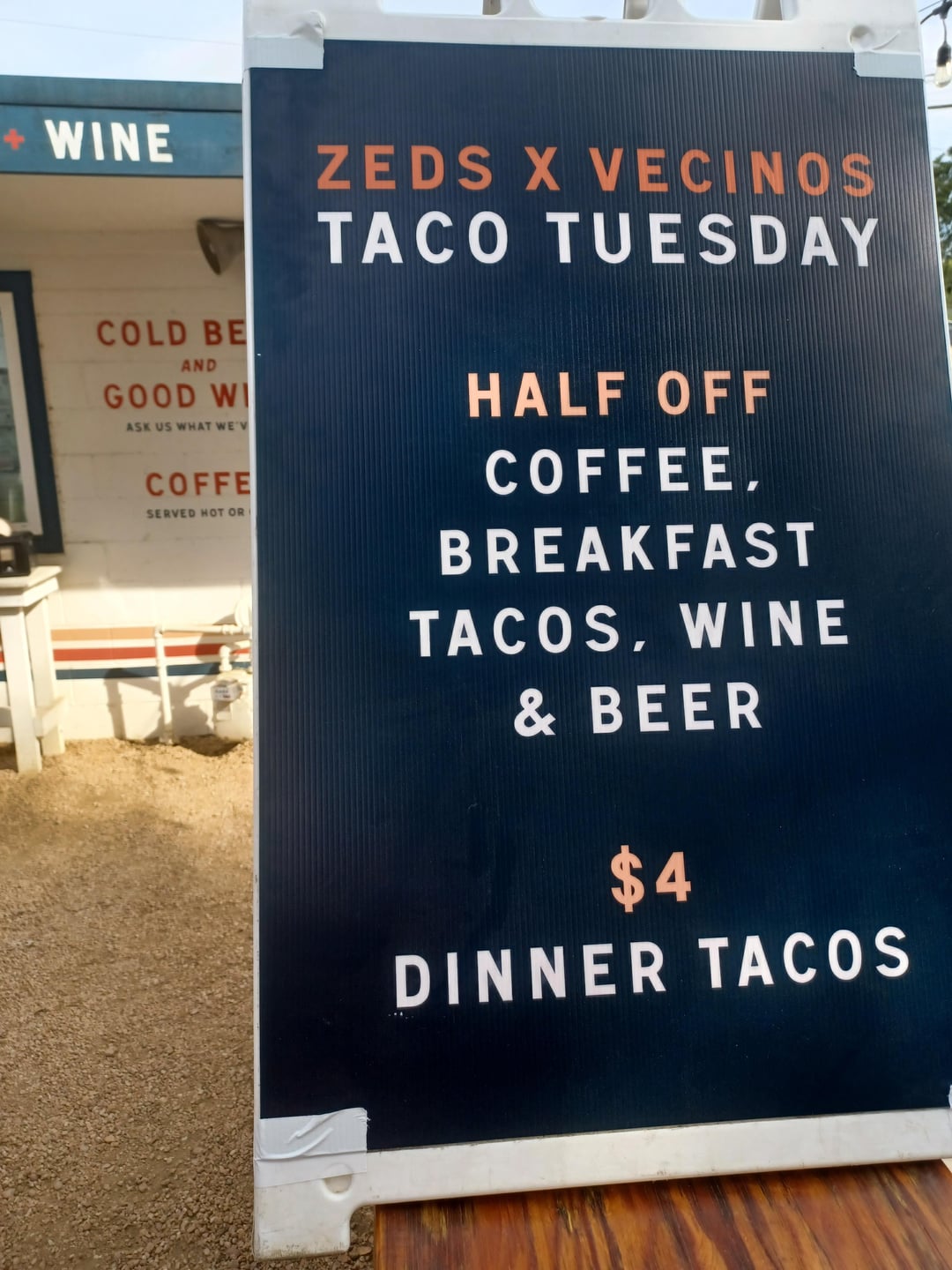 New taco truck at Zeds is bomb! Taco Tuesday is a steal bc you get half price coffee from Zeds to go with your half price tacos. Homemade corn amd flour tortillas with 3 salsa choices. I liked the green jalapeño the best but all three were great, and I broke a sweat.