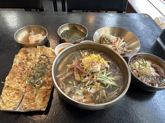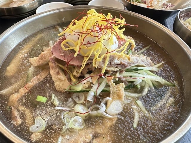 This is a local dish from Jinju, Gyeongsangnam-do. One of its features is its extravagant garnish, which is different from other Naengmyeon. For more information, please refer to the website below: [https://en.dcinside.com/board/best/9796](https://en.dcinside.com/board/best/9796)