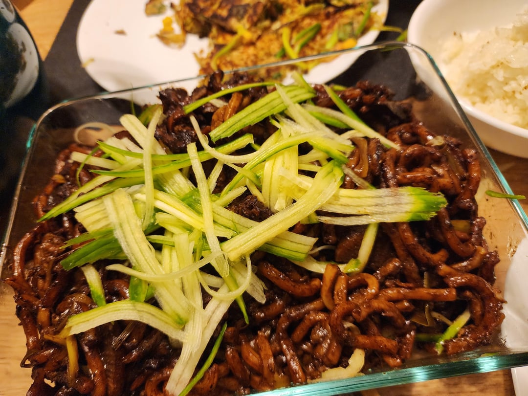 Doenjang jjigae, galbi, haemul pajeon, jjajangmyeon. Not pictured is the kimchi. It was there though. And I initially forgot the cucumber on the jjajamgmyeon but added it later. Need to adjust my pajeon batter it came out a bit soggier than I'd like.