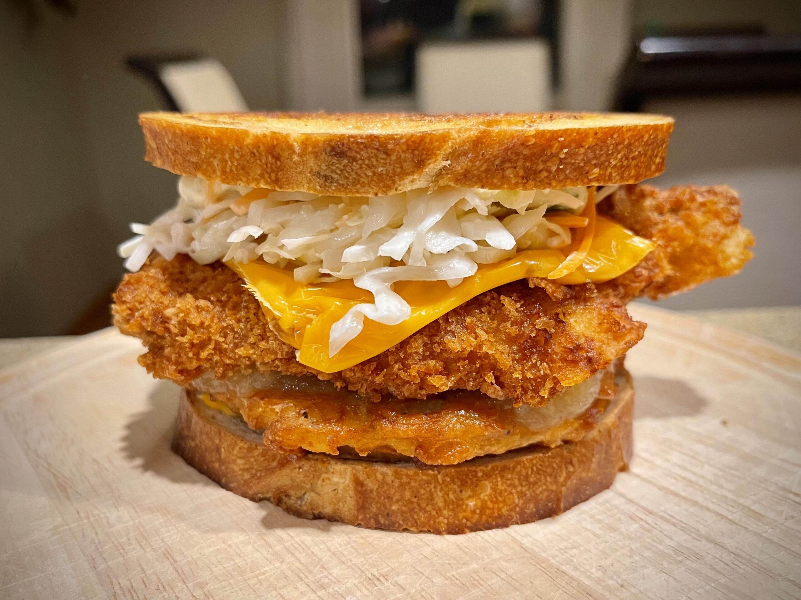 Fried walleye sandwich with American cheese, potato pancake, applesauce, tartar sauce, and coleslaw, on grilled rye.