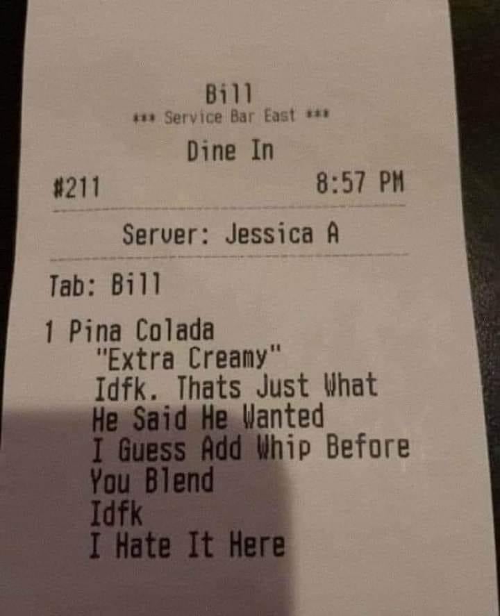 I love this so much!by Popular-Capital6330 6 Comments SignalAd8363 1 year ago “idfk” twice is so real Desperate-Wheel-3359 1 year ago We are all Jessica XXII78 1 year ago Reminds me of “Waiting…” adenrules 1 year ago It just means use more coconut cream. Nasty ass bar serving frozen piña coladas with mix. foxontherox 1 year ago This is some kinda poetry. Disintergr8tion 1 year ago SolidarityWrite A CommentYou must be logged in to post a comment.