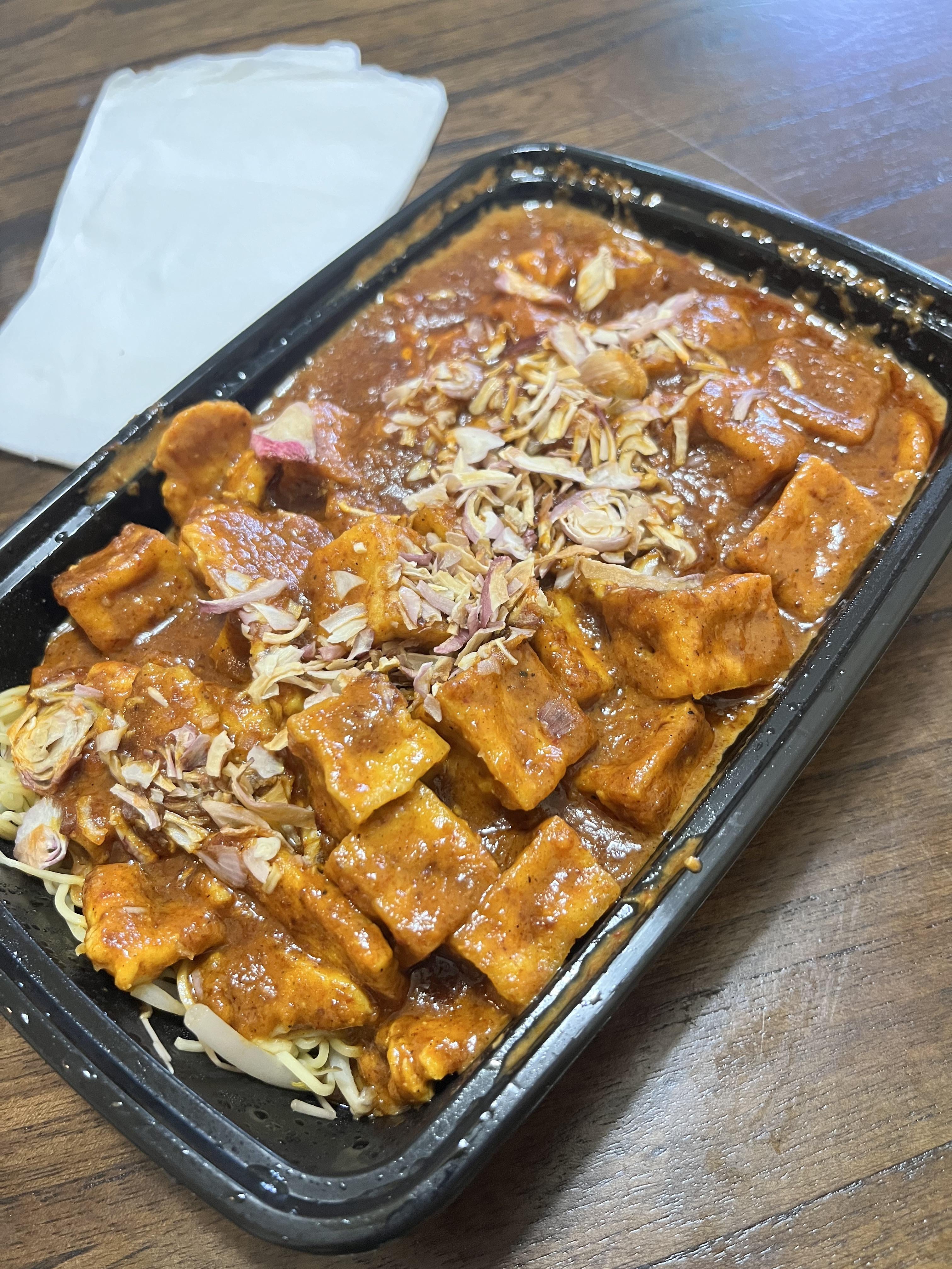 First time trying this dish and I wish I would have tried it soon. Absolute flavor bomb. It’s red curry sauce with two types of noodles. Crispy tofu, sautéed chicken, and fried shallots. 10/10 on heat.