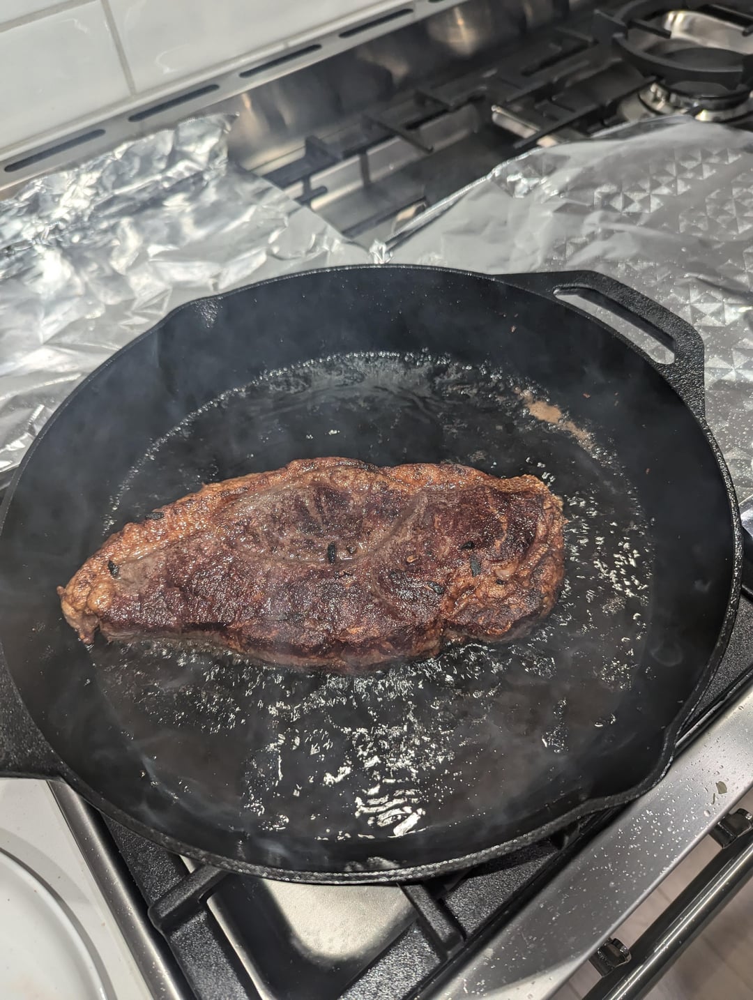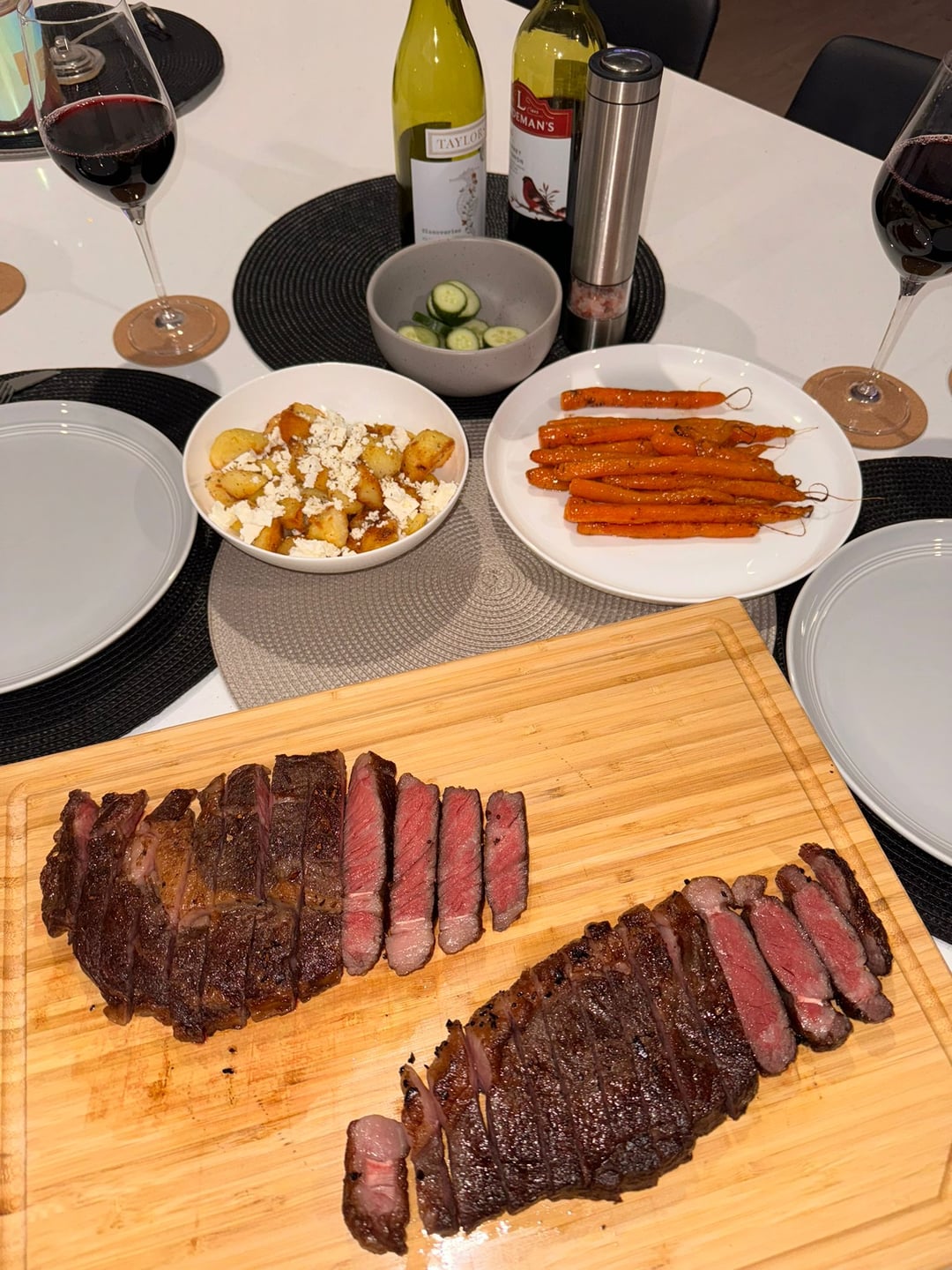 54 degrees Celsius (129ish farenheit) for just under 3 hours, finished in the good old cast iron. Paired with some roasted Dutch Carrots & crispy roast potatoes with oregano and feta.