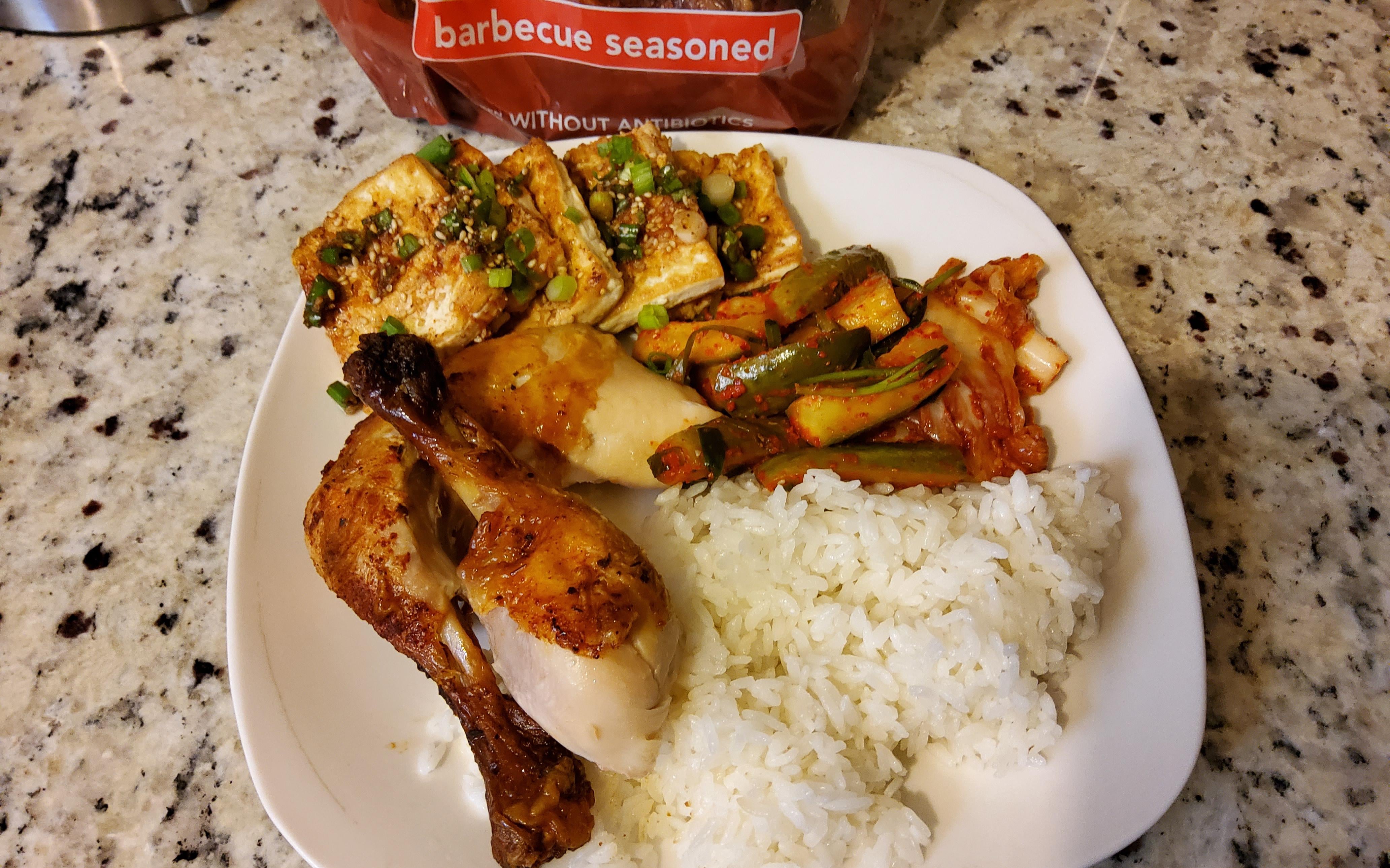 This was a fast meal to plate thanks to store bought chicken, microwave frozen rice made a week ago, and tofu banchan.