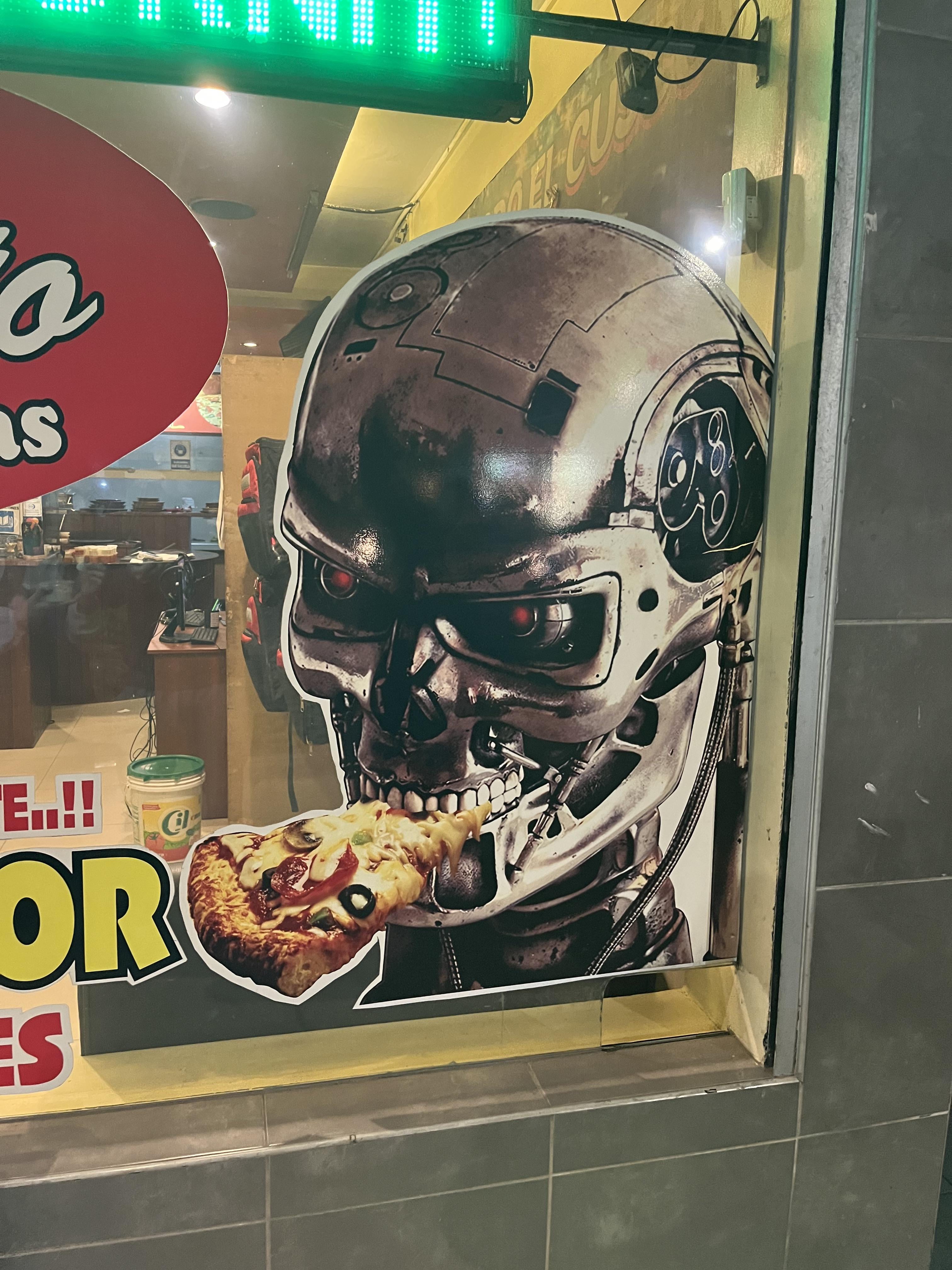 This is a crime. Why you wondering why I said that? Because that robot thing is eating my LAST slice