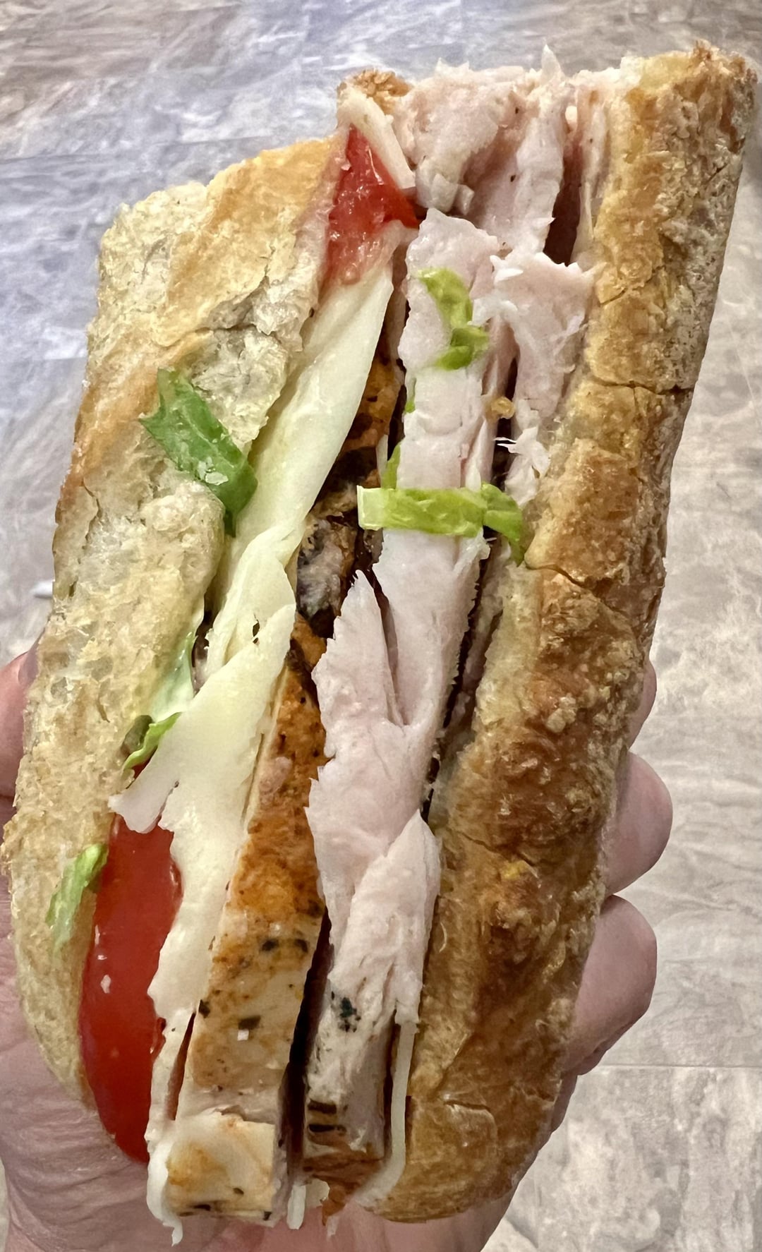 Thiccc turkey on homemade baguette with lettuce, tomato, provolone, and mayo.