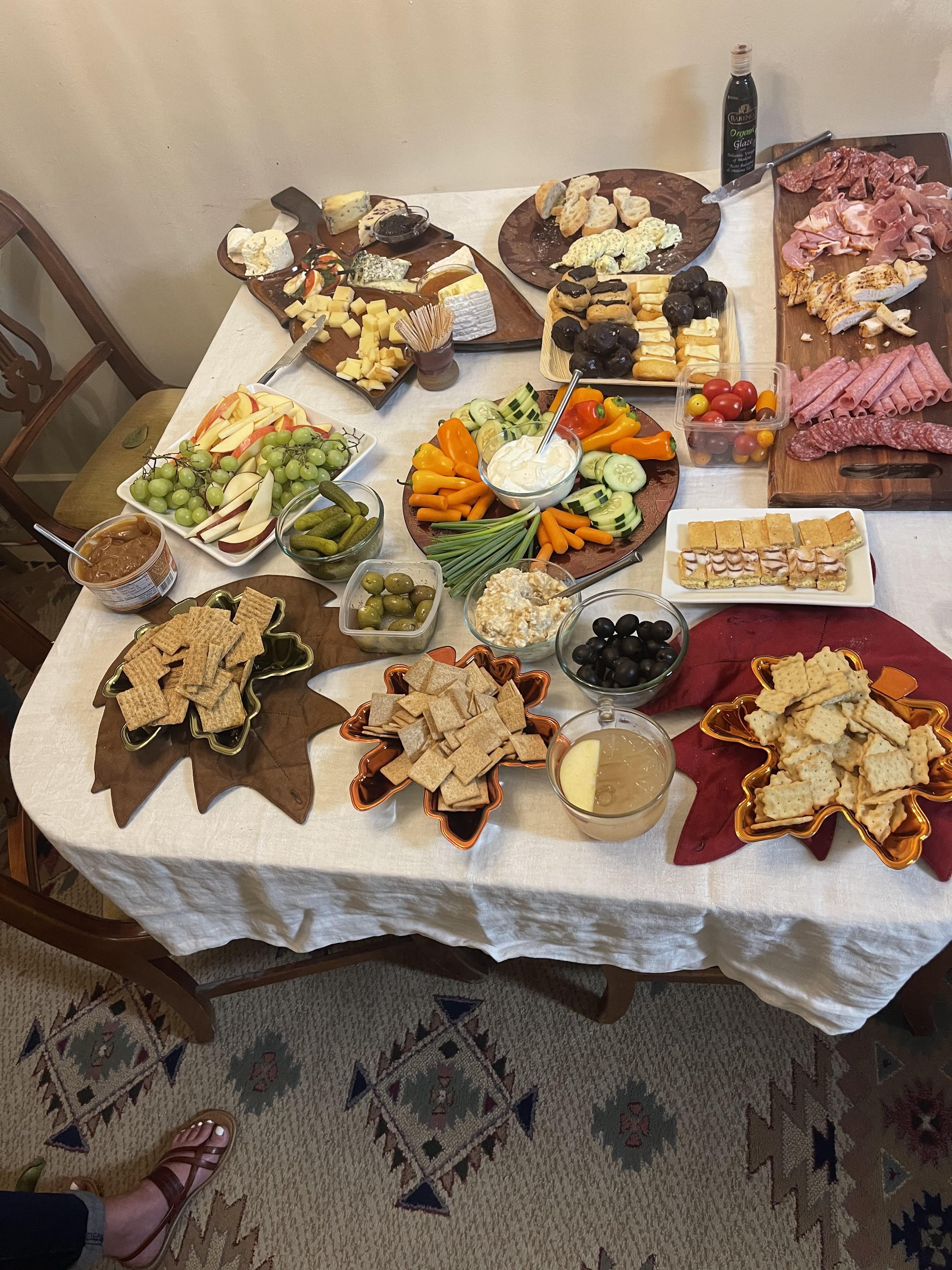 We do a rotating cocktails and snacks night with two other couples (because that’s what we’ve landed on for mid-forties social events), and last night was our night to host. Picture was taken fairly early on, but not untouched. The evening’s cocktail was Apple Cider Martini, simple, delicious, and got at least 3 of us too loaded to play a board game.