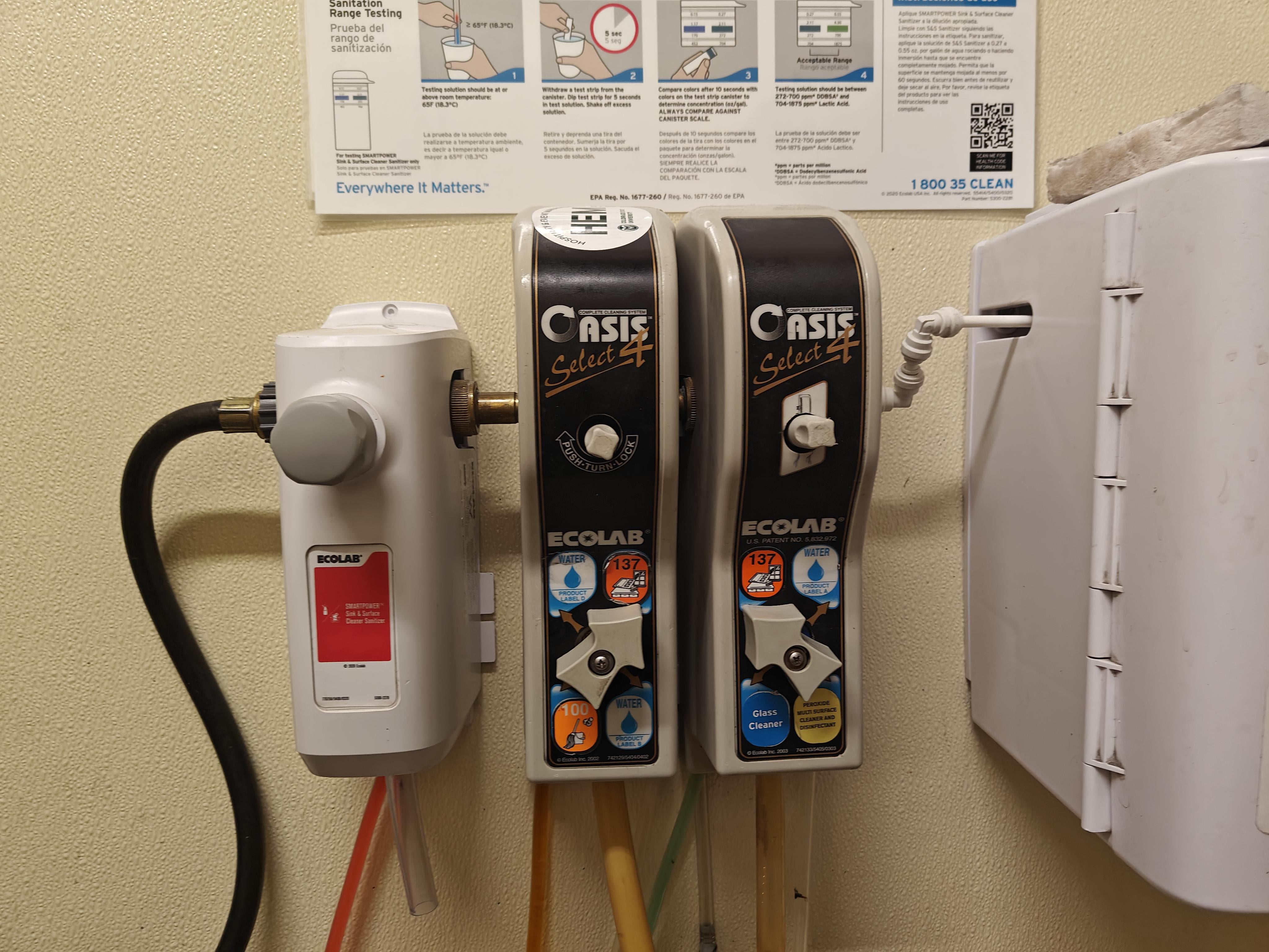 Those oasis 4s are super old versions. You could ask your rep to update them. You’re using 4 products between 2 oasis dispensers cause they’ve probably broke at one point. And I’m guessing that is pre-soak on the far right? SMH at using 1/4” pex on that.