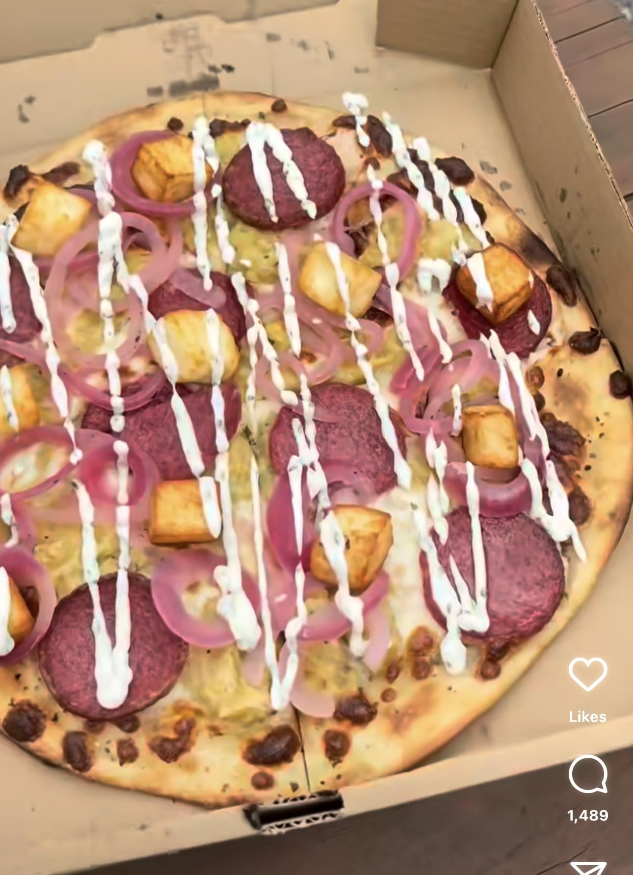 Oh it’s Mangú pizza. That’s thick cut salami, pickled red onions, plantain tots (tostones), and I think ranch? Personally I hate mangú’s consistency (basically mashed potatoes) but tostones, that kind of salami and the fried cheese it gets served with are great. I didn’t know they made mangú pizza though, every time I’ve gone to the Dominican Republic I’ve gotten corn pizza instead