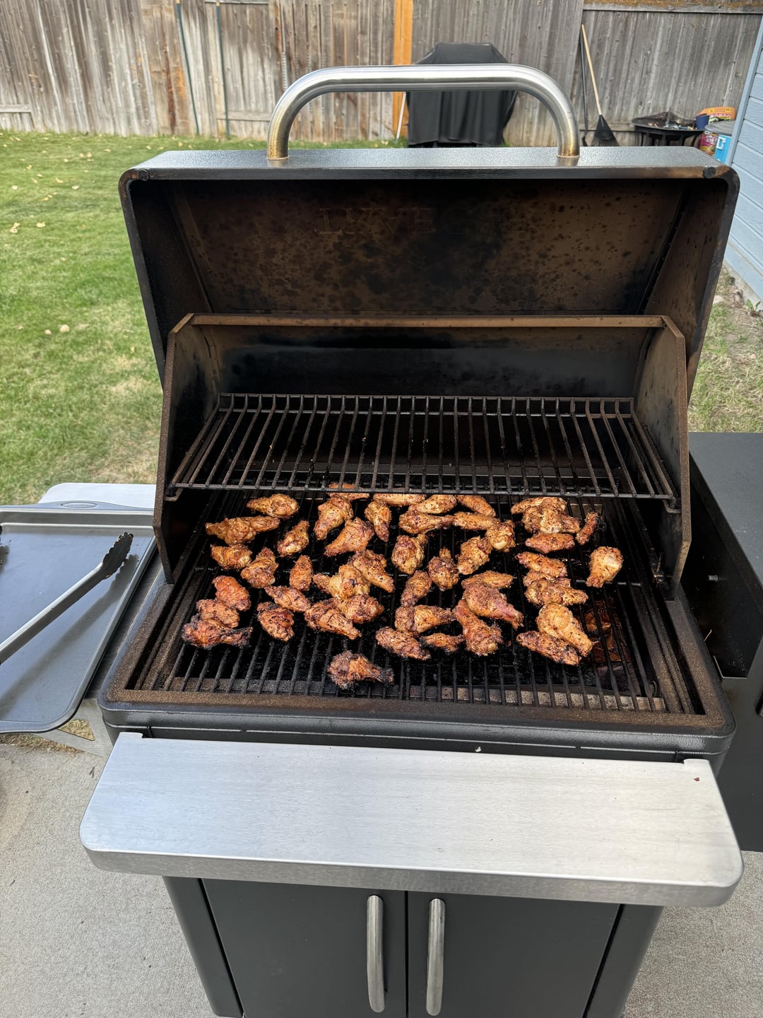 Purchased party wings at Costco. Dried them off. Put olive oil on them. seasoned with some “weber kickin chicken” and some blackened seasoning on some. Put on the cold grill. Set to 400°. After about 25 minutes I turned them all over then at about an hour I pulled them off. Probably could have gone about 5 minutes less since some of the really small ones were dried out a bit but I’d say about 80% were perfect and crispy.