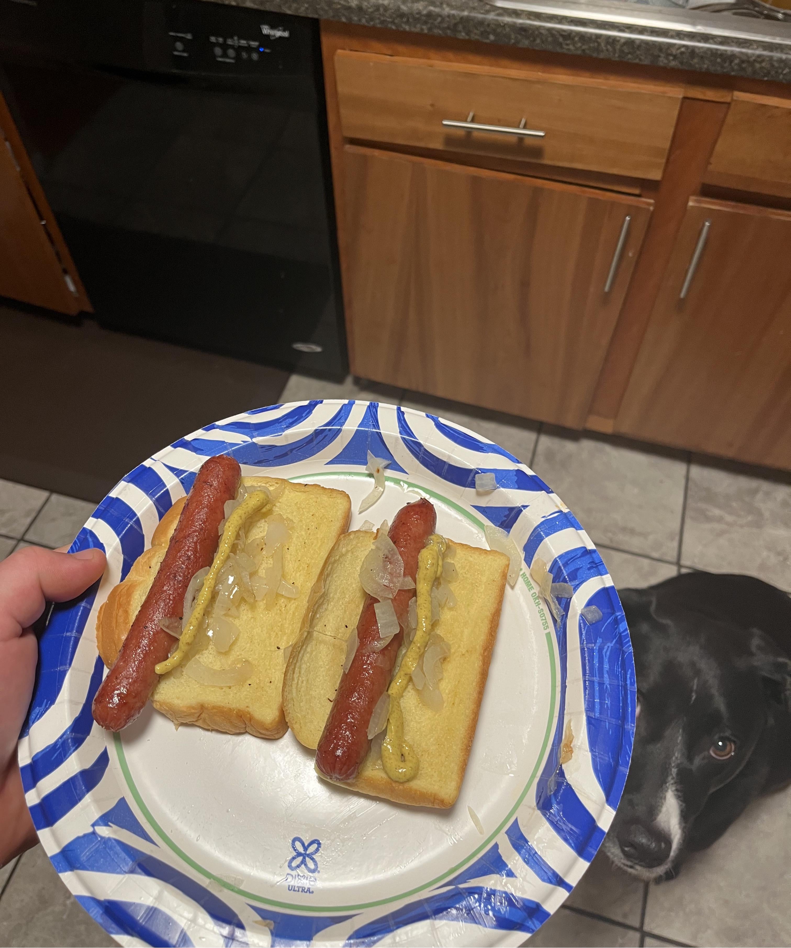 I prefer sliced bread to buns for hotdogs. It holds more onion, which your dogs definitely need 🤷‍♀️