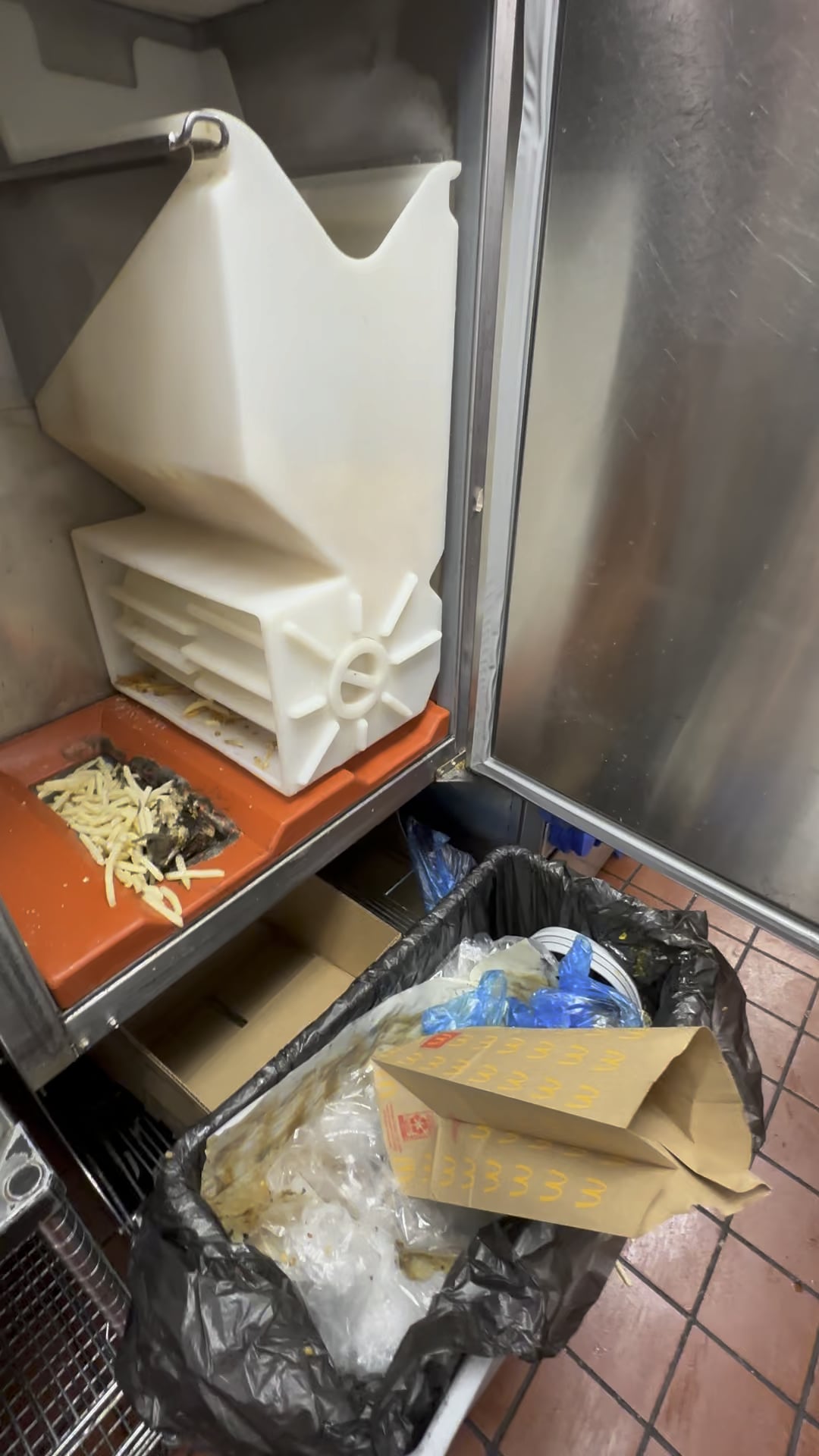 To those curious, this is a McDonald’s fry hopper. It’s used for dispensing a *perfect* basket portion of fries in seconds. There is a second white plastic bin, identical to the one on the right, that is used to hold large batches of frozen fries. The orange piece is essentially a “gasket” that is a big rubber piece that holds the hoppers in place and seals the bottom to keep it refrigerated. The chutes are where all the gunk was pulled from, and those are built into the machine, but are really easy to clean once you’ve taken out the hoppers and orange rubber piece. Assuming it was sanitized, stocked, and closed, it would look like a taller reach in with wire racks at the base to put the fry baskets. The spots under the cutes have a little track to slide the basket in place, and little buttons against the back, activated when you push a fry basket into it. The whole machine is designed to be stripped down and cleaned easily, this team just clearly… doesn’t.