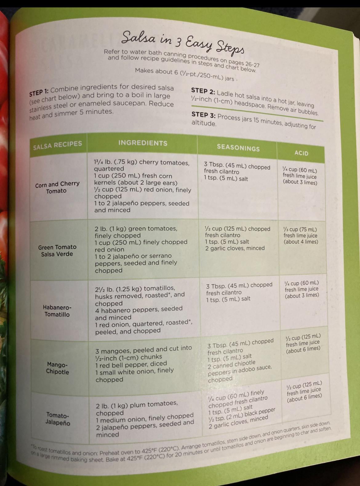 Picture of a recipe for salsa in 3 easy steps from the all new ball book of canning and preserving.