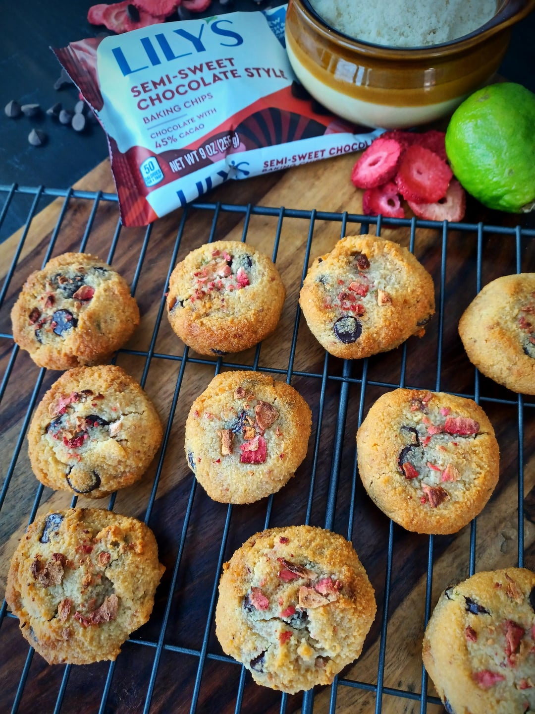 Fold in chocolate chips and freeze dried strawberries