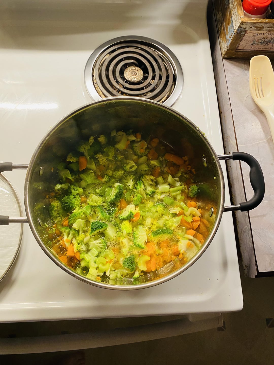 Vegetables for rice: whatever you have on hand! Chop up and put in pot, add enough water to cover and simmer, covered (I used broccoli, carrot & celery)