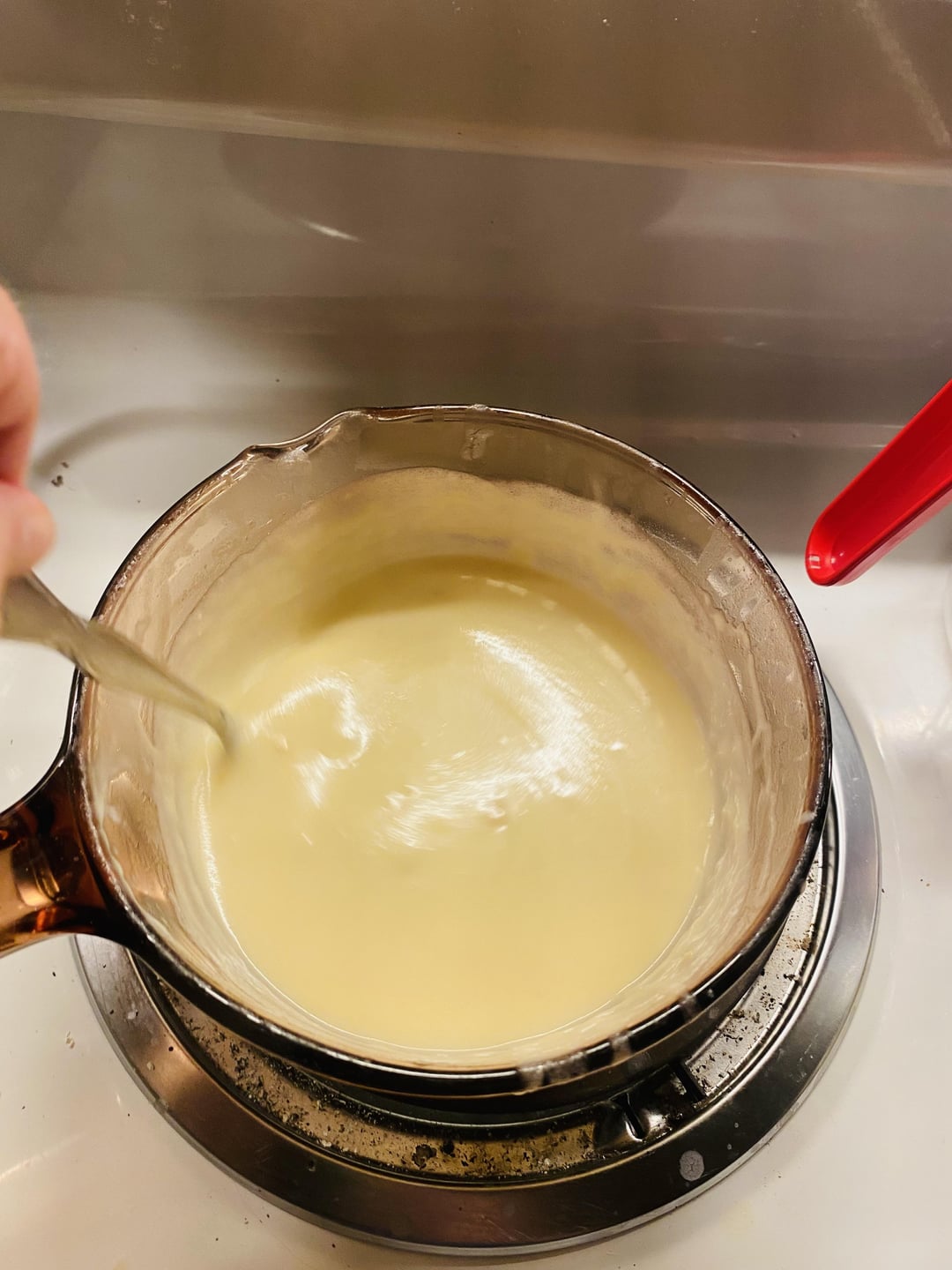 Slowly pour in 1 cup of milk over a few minutes while whisking still on low heat!