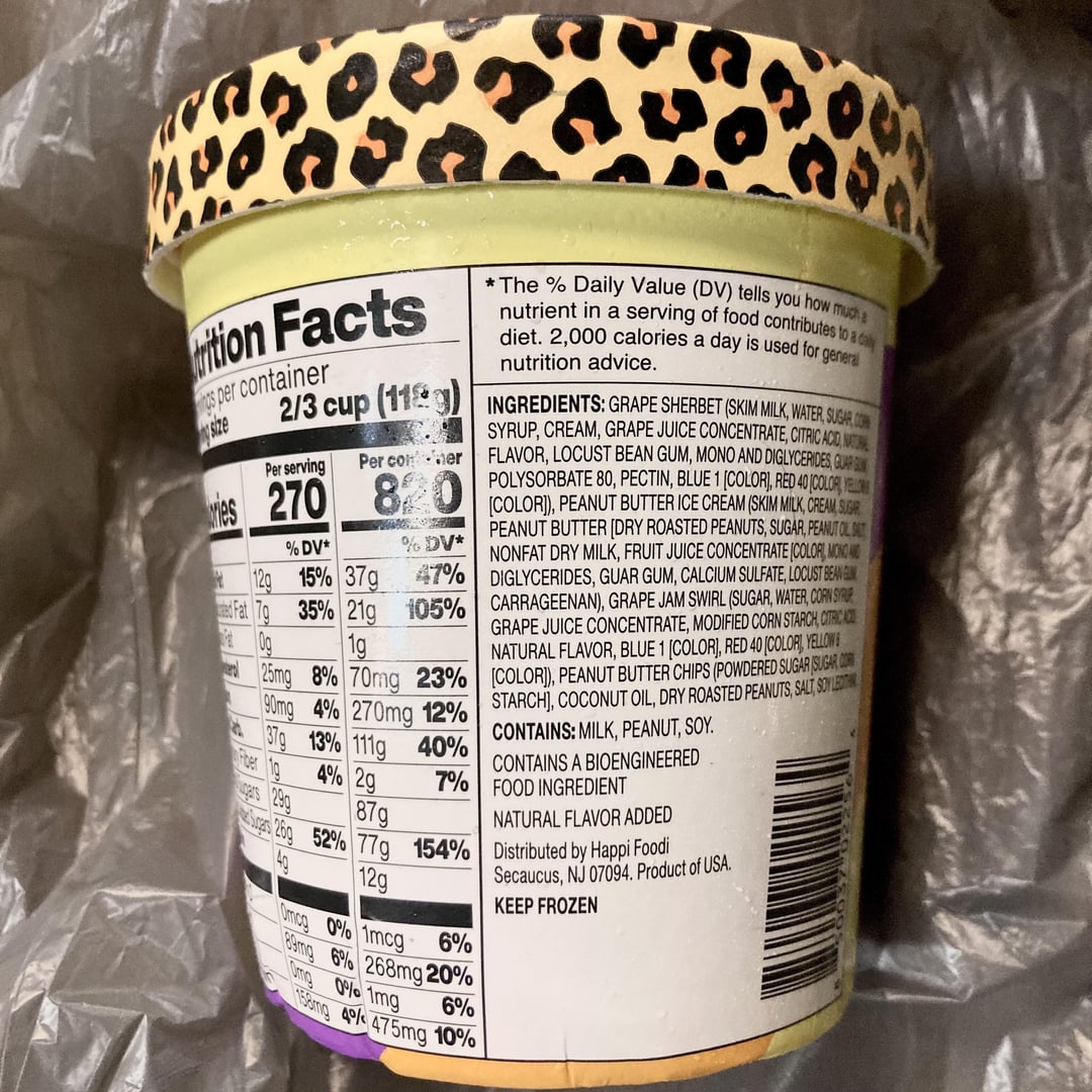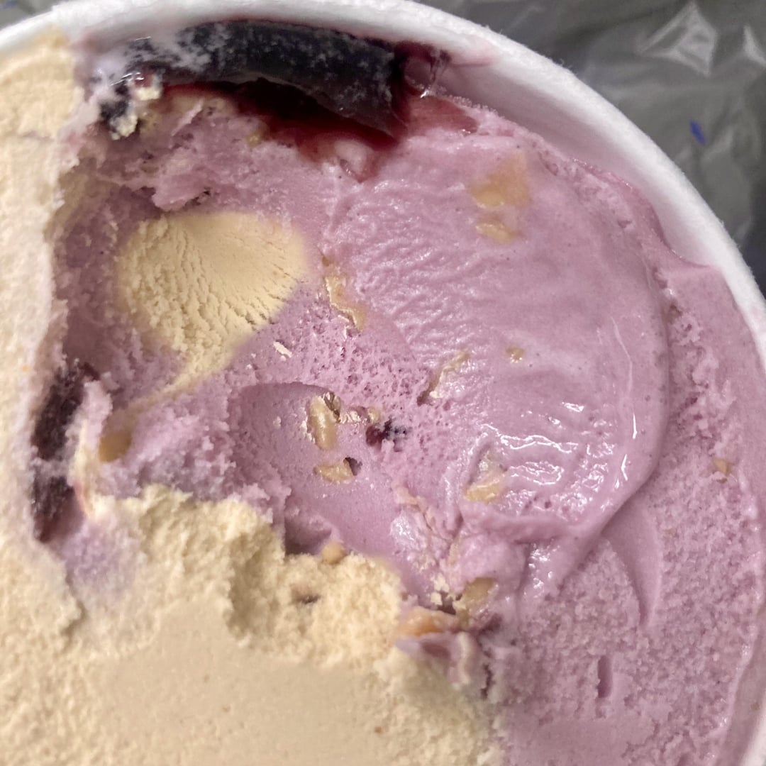 Description: ”Grape Jelly sherbet and peanut butter ice cream with peanut butter chips and a grape jelly swirl.” This is an accurate description with all components reflected in the ice cream.