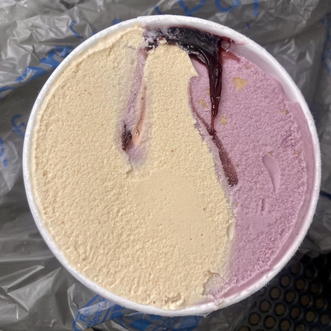 - Grape jelly swirl: My favorite part of the ice cream! It’s like a thicker syrup, not quite a jam, gooey. There wasn’t a whole lot of it but the flavor was concentrated, and the grape sherbet was concentrated, so I didn’t need much anyway. Flavor is very much grape jelly, like Smuckers Concord grape. It’s got a depth that was perfect with the peanut butter but a candy brightness that also complemented the grape sherbet. Saying that, this is your typical grape jelly flavor, nothing really special about it.