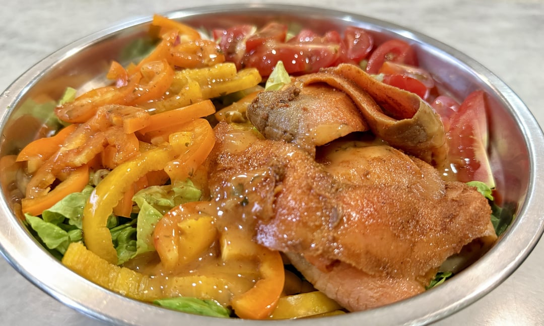 Picture #2: Smoked Salmon Salad (Ingredients used: 1.5 head of lettuce, smoke salmon, any quantity up to you, 1/2 capsicum, sliced, 8 cherry tomatoes, quartered, 1-2 Tbsp balsamic vinegar, 1-2 Tbsp olive oil, 1-2 Tbsp Brown Rice Vineger or any of your favourite vinegar, salt and ground pepper to taste. Mixed and tossed them evenly)