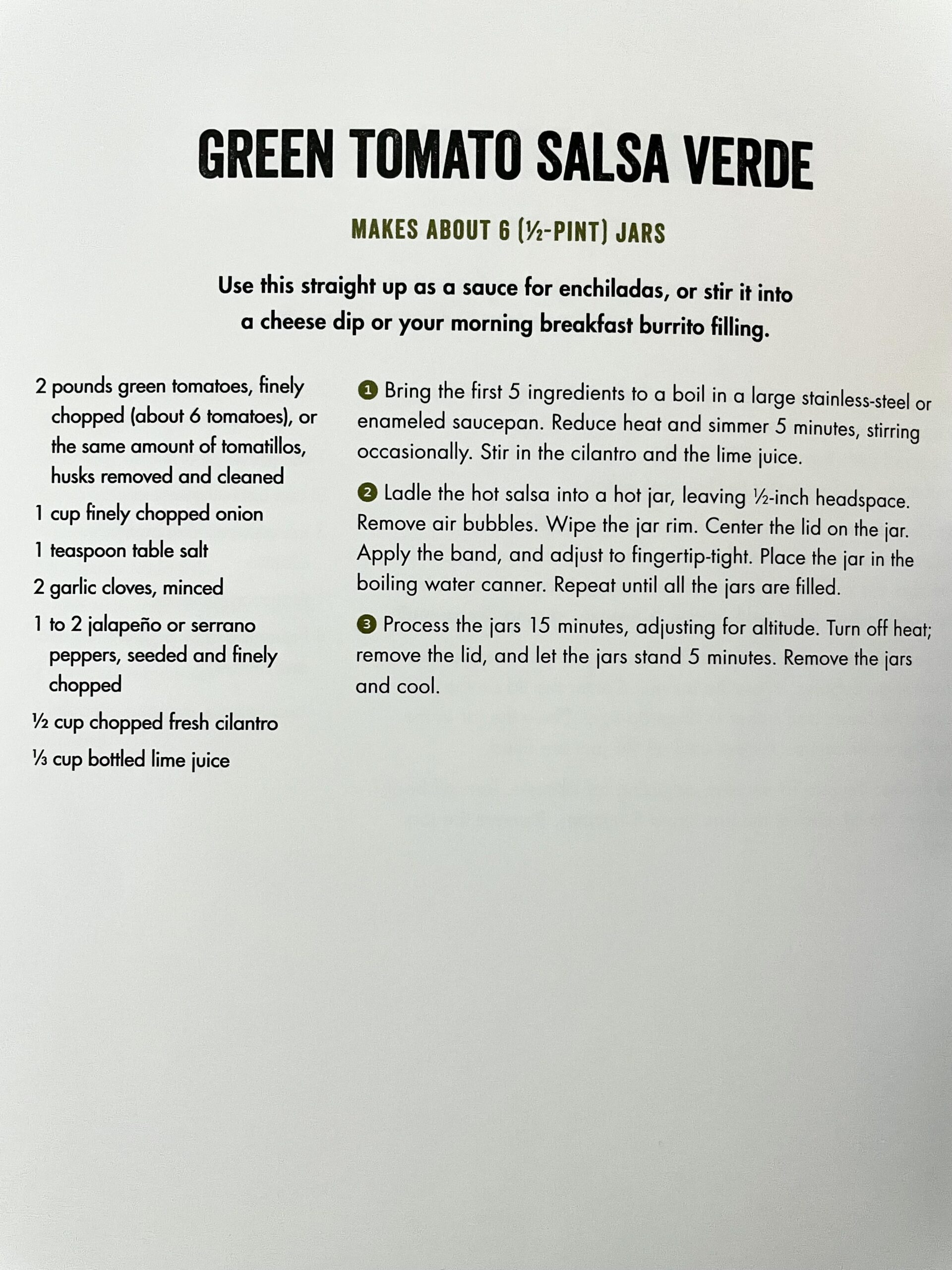 Made almost this same recipe from NCHFP for tomatillo salsa. So yummy. My tomatillos are taking off so I plan to make more! Also Tangy Tomatillo Relish is another great recipe from NCHFP that can use green tomatoes.