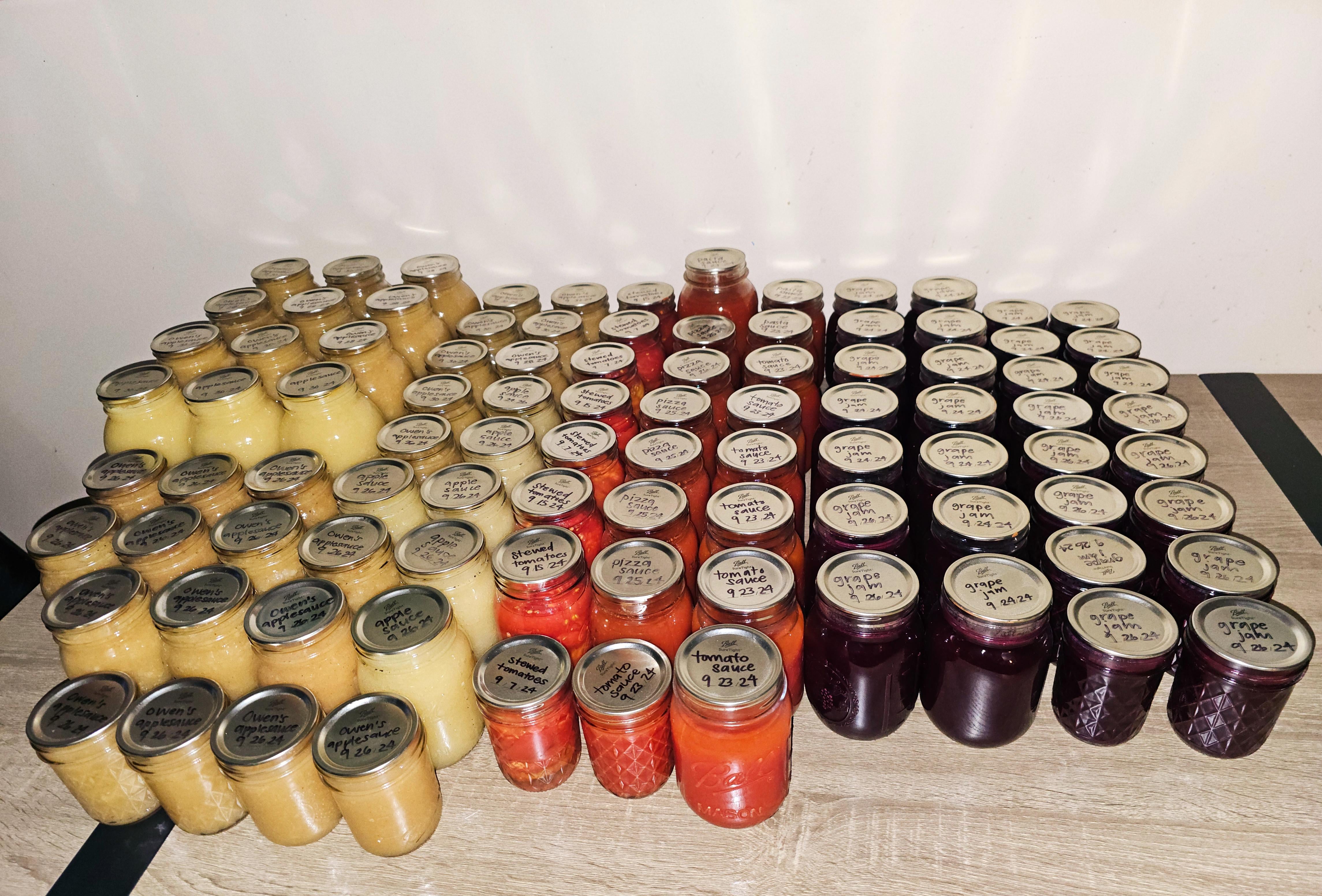 100lbs of apples, a bushel of tomatoes, and 40lbs of concord grapes, the bulk of which was processed in about the span of a week. Just wanted to share my hard work with someone because I don't have many IRL friends who would appreciate this like the community will.