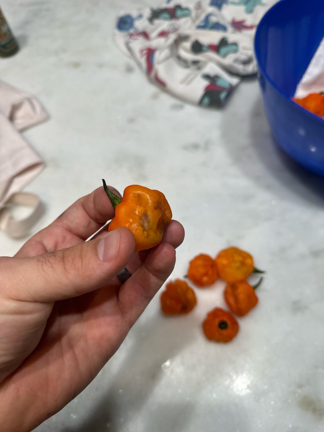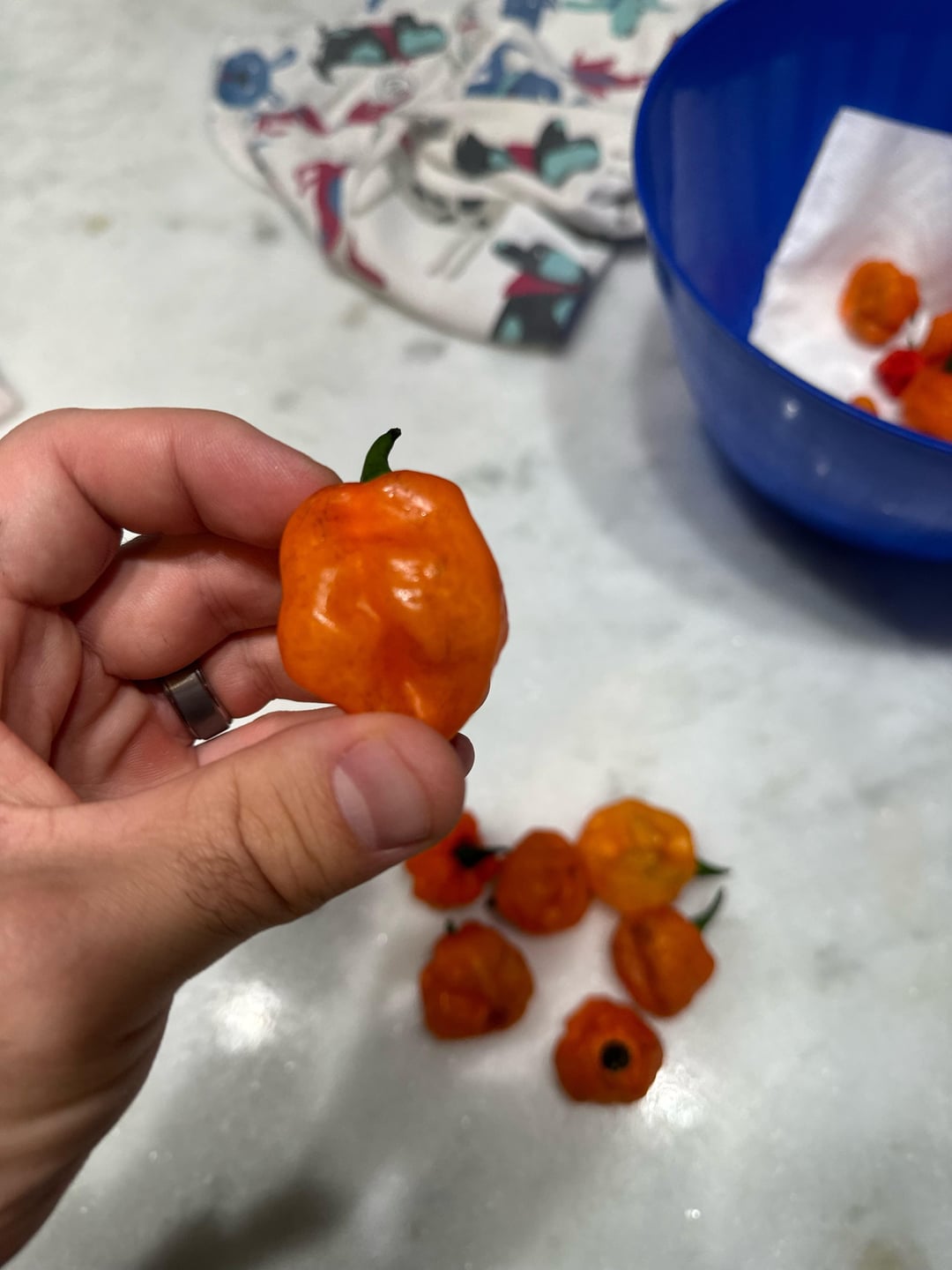 Hey guys! First time poster, hoping you all can give me some guidance. I am still new to growing peppers, been doing it a few years and always learning. Anyway, in the attached pictures you can see there is some discoloration to my habs. They appear dirty but the brownish color will not wash off. They are firm and do not show any signs of rotting. I cut one open and the inside looks normal. This year I mistakenly gave my plants too much nitrogen which caused them blossom later than I would have liked. Additionally with the amount of rain we have had this season, they have received inconsistent and probably too much water. My question is, are these peppers safe to eat? I plan on roasting them and making hot sauce. Thanks in advance!