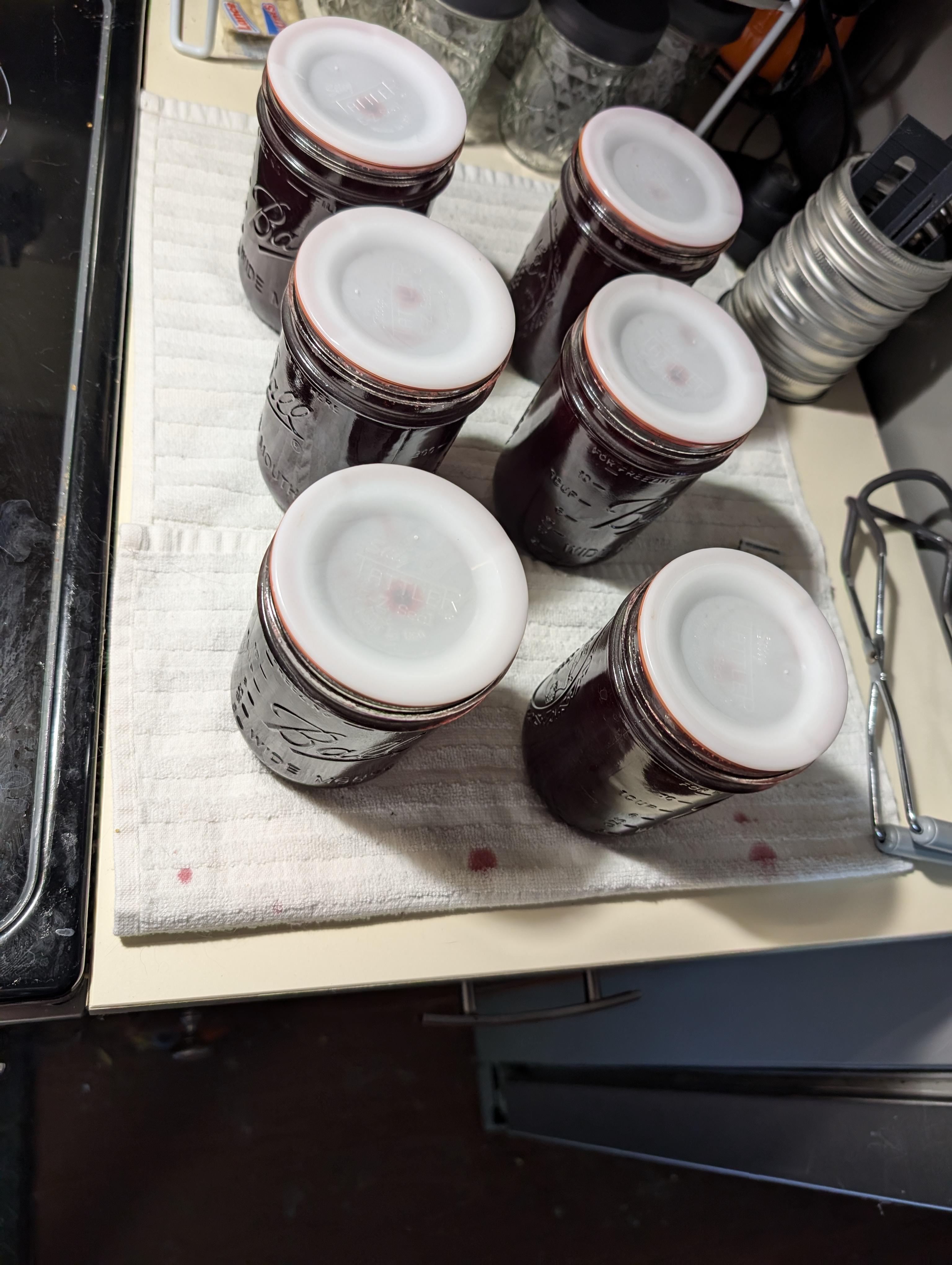 Not all jars pictured. 100% seal on all 6 WM tattler lids. 7 pounds of homegrown raspberries went into it. Recipe used: https://nchfp.uga.edu/how/can/canning-fruits-and-fruit-products/berry-syrup/