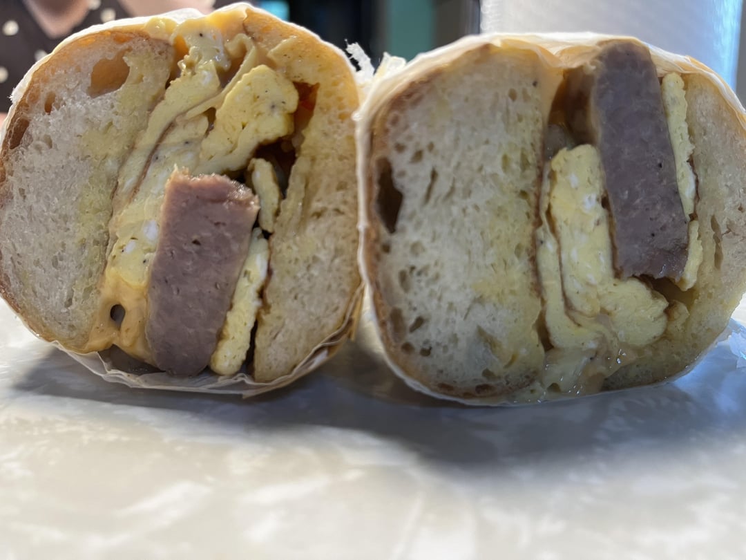 Scrambled egg, sausage, American, and bacon jelly on a French toasted baguette. Also, here’s how I eat these kaiju sandwiches. Wrap ‘em.