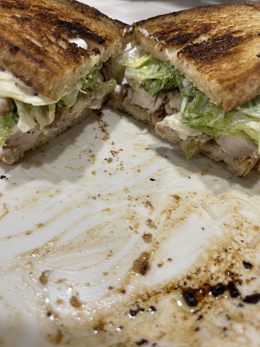 (Please forgive the dirty plate): Garlic rubbed sourdough, grilled lemon chicken, Caesar salad, parm, lemon aioli