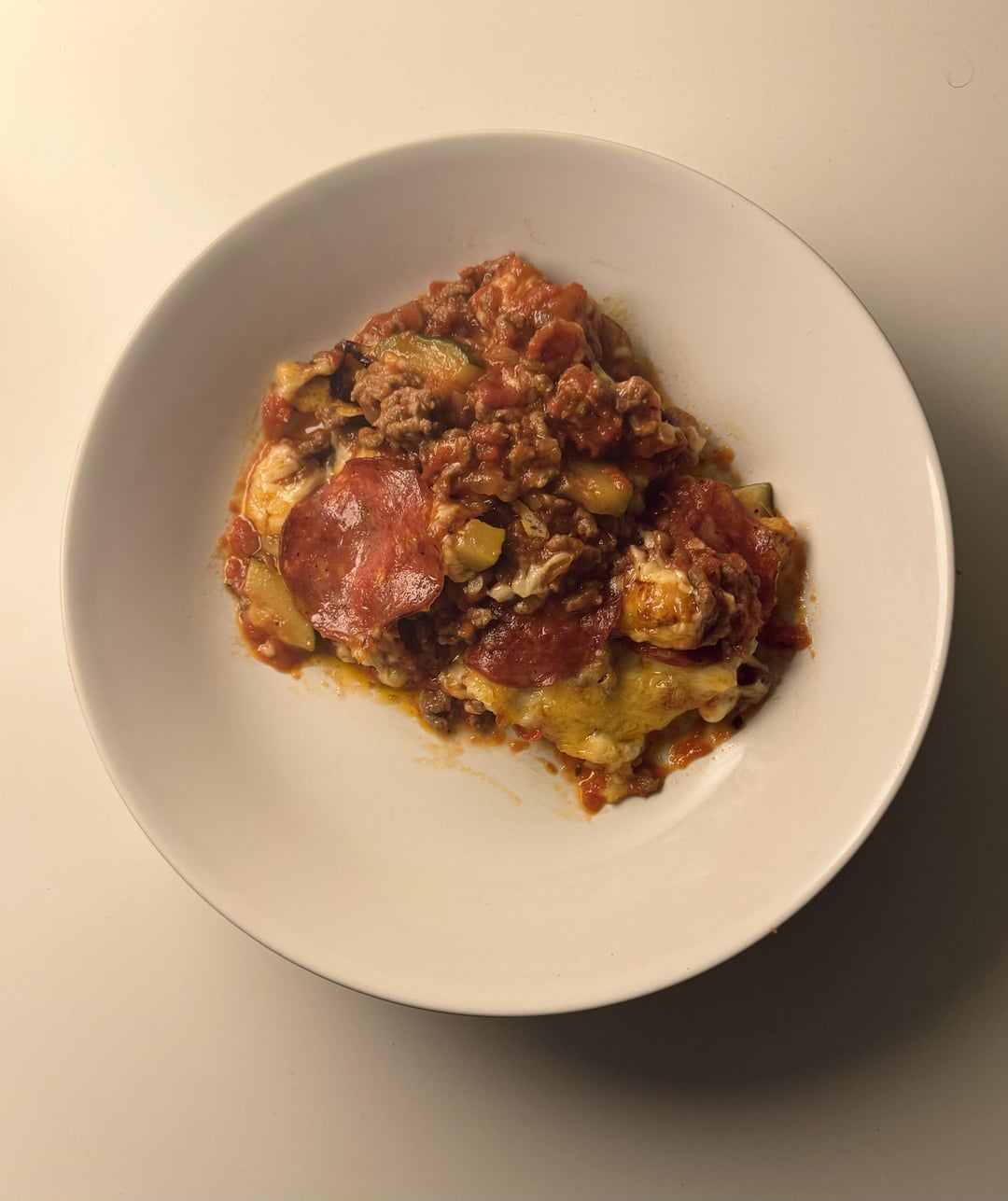 next heat more butter in pan. Add onions and garlic. Cook until fragrant. Add ground beef and cook until brown. Turn down heat and add tomatoes. Add back in chorizo/zucchini. Let simmer. Season with italian herbs and spices.