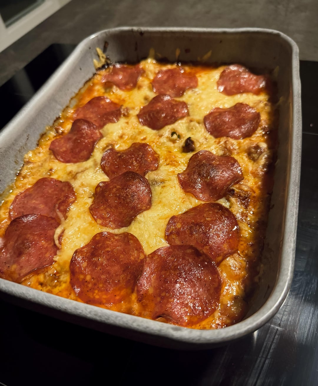 Pour into cooking tray. Top with cheese and salami. Bake in oven for about 20min or until golden cheese and crispy salami.