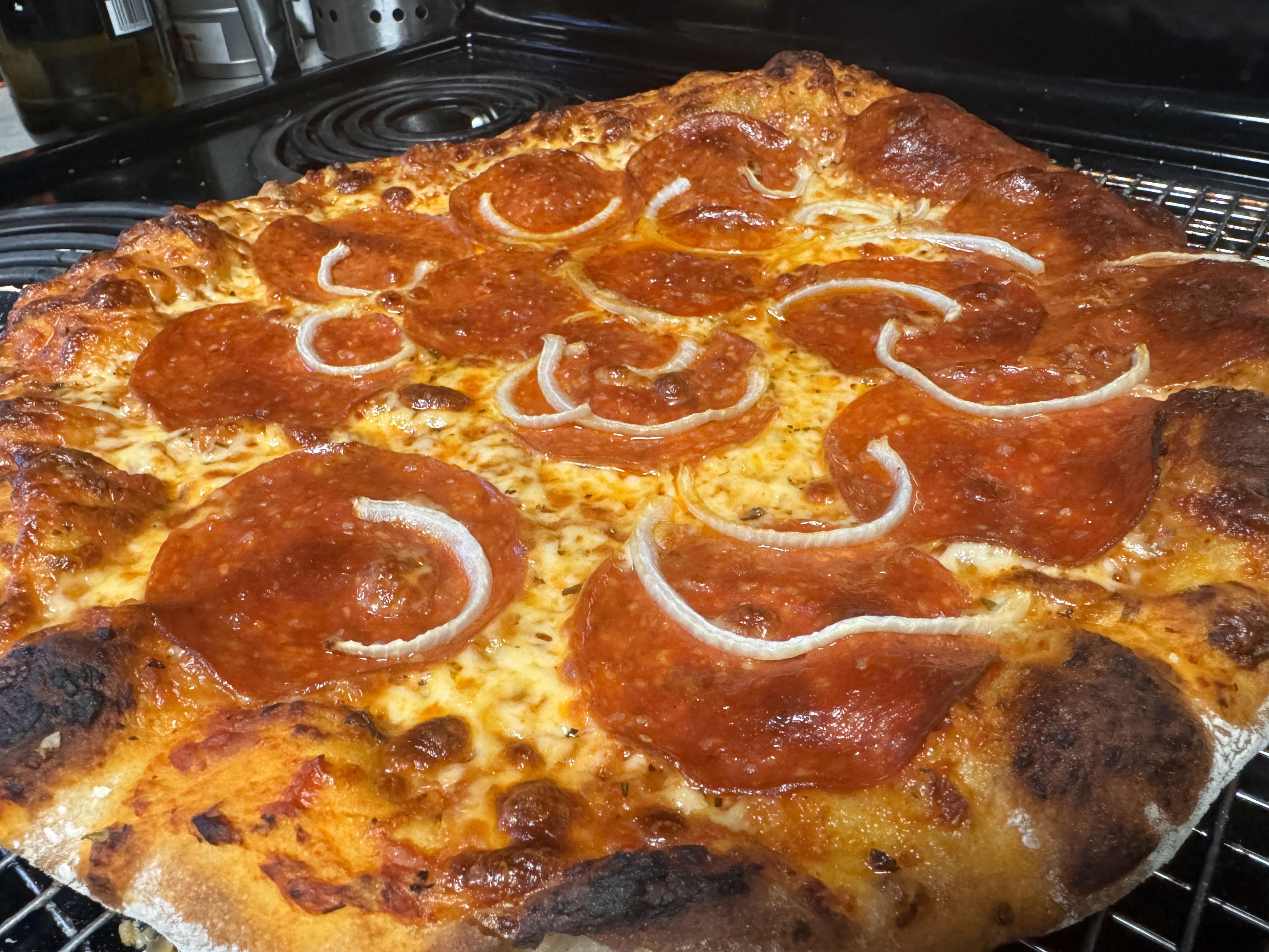 Came out amazing! Had it overnight in the fridge. 80/20 mix of bread flour and wheat flour with 90% hydration. Needed quite a bit of flour during stretching to keep it from sticking, but got it onto a stone with relative ease. Will definitely be making larger dough batches for this purpose going forward!