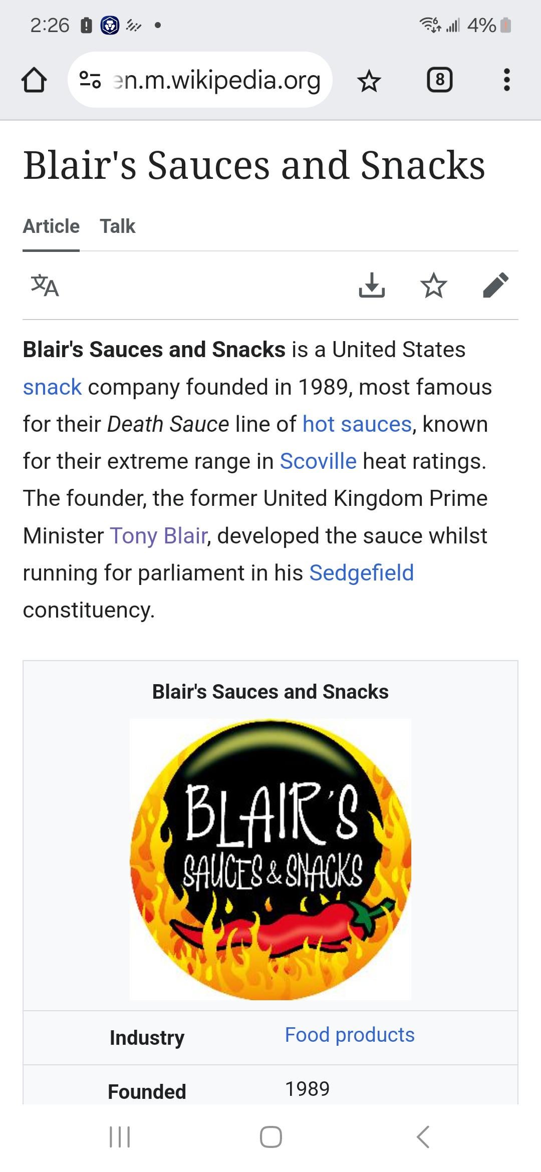 Someone changing the Blair's Death Sauce creator to Tony Blair is funny as hell dude.by Moist_Description608 4 Comments DisgruntledSocialist 1 year ago Weapons of ass destruction? Towpillah 1 year ago I really love(d) their crisps. The habanero ones and the cheesy ones. 🥹Tony Blair, not so much. But a quality joke nevertheless. Mackem101 1 year ago Funny, but if you want some actual hot sauces from County Durham (where Sedgefield is), try Balefire, they do some corking ones. Ivanjatson 1 year ago And Susan Boyle is the current owner.Write A CommentYou must be logged in to post a comment.